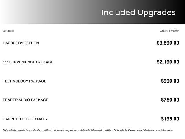 4WD, 120V Power Outlet in Bed, 120V Power Outlet in Rear Center Console, 16" Alloy Wheels, 17" Alloy Wheels, 17" Heritage Alloy Wheels, 3.692 Axle Ratio, 4-Wheel Disc Brakes, 6 Speakers, ABS brakes, Air Conditioning, Alloy wheels, AM/FM radio: SiriusXM, Anti-whiplash front head restraints, Apple CarPlay/Android Auto, Black Exterior Decals, Black Front & Rear Bumpers, Black Outside Mirrors, Brake assist, Bumpers: body-color, Carpeted Floor Mats, Delay-off headlights, Driver door bin, Driver vanity mirror, Dual front impact airbags, Dual front side impact airbags, Electronic Stability Control, Exhaust Finisher, Fender Audio Package, Fender Flares, Fender Premium Audio System w/10 Speakers, Front anti-roll bar, Front Bucket Seats, Front Center Armrest, Front Halogen Fog Lights, Front reading lights, Front wheel independent suspension, Fully automatic headlights, Hardbody Edition, Heated Front Seats, Heated Leather Steering Wheel, Heated Outside Mirrors, High Beam Assist (HBA), HVAC - Dual-Zone Front Auto A/C, I-Key w/Request Switches on O/S Handles, Illuminated entry, Illuminated Locking Glove Box, Intelligent Cruise Control, Knee airbag, Lane Departure Warning System, Leather Shift Lever, Low tire pressure warning, Lower Fascia, Handle & Grille, Mud Flaps, Occupant sensing airbag, Overhead airbag, Overhead Console Storage (Sunglass Holder), Panic alarm, Partial Under-Seat Storage Delete, Passenger door bin, Passenger vanity mirror, Power door mirrors, Power driver seat, Power steering, Power windows, Premium Cloth Seat Trim, Radio data system, Radio: SXM/AM/FM/AUX/USB Audio System, Rear anti-roll bar, Rear Automatic Braking (RAB), Rear Cross Traffic Alert (RCTA), Rear seat center armrest, Rear side impact airbag, Rear Sonar System, Rear step bumper, Remote Engine Starter, Remote keyless entry, Security system, Side Rail w/o Steps, Sliding Rear Window, Speed control, Speed-sensing steering, Split folding rear seat, Sport Bar, Spray-In Bedliner, Steering wheel mounted audio controls, SV Convenience Package, Tachometer, Technology Package, Tilt steering wheel, Tow Package (T11), Tow/Haul Mode Switch, Traction control, Trailer Hitch w/Wiring Harness, Trip computer, Utili-Track System, Variably intermittent wipers, Voltmeter, 4WD.
