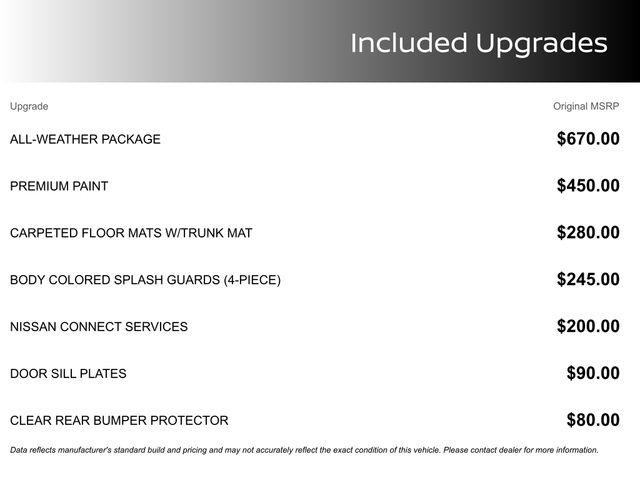 CVT with Xtronic, Charcoal Cloth, 16" Alloy Wheels, 4-Wheel Disc Brakes, 8 Speakers, ABS brakes, Air Conditioning, All-Weather Package, Alloy wheels, AM/FM radio: SiriusXM, Auto High-beam Headlights, Blind Spot Warning, Body Colored Splash Guards (4-Piece), Brake assist, Bumpers: body-color, Carpeted Floor Mats w/Trunk Mat, Clear Rear Bumper Protector, Delay-off headlights, Door Sill Plates, Driver door bin, Driver vanity mirror, Dual front impact airbags, Dual front side impact airbags, Dual Zone Auto Climate Control, Electronic Stability Control, Four wheel independent suspension, Front anti-roll bar, Front Bucket Seats, Front Center Armrest, Front reading lights, Fully automatic headlights, Heated Exterior Mirrors, Heated Front Seats, Illuminated entry, Knee airbag, Leather-Wrapped Heated Steering Wheel, Low tire pressure warning, Nissan Connect Services, NissanConnect featuring Apple CarPlay and Android Auto, NissanConnect Services, Occupant sensing airbag, Outside temperature display, Overhead airbag, Overhead console, Panic alarm, Passenger door bin, Passenger vanity mirror, Power door mirrors, Power steering, Power windows, Premium Paint, Radio data system, Radio: AM/FM w/RDS/MP3/Aux-In, Rear anti-roll bar, Rear Parking Sensors, Rear side impact airbag, Rear window defroster, Remote Engine Start, Remote keyless entry, Security system, Speed control, Speed-sensing steering, Split folding rear seat, Steering wheel mounted audio controls, Tachometer, Telescoping steering wheel, Tilt steering wheel, Traction control, Trip computer, Upgraded Cloth Seat Trim, Variably intermittent wipers, Wi-Fi Hotspot, CVT with Xtronic, Charcoal Cloth.