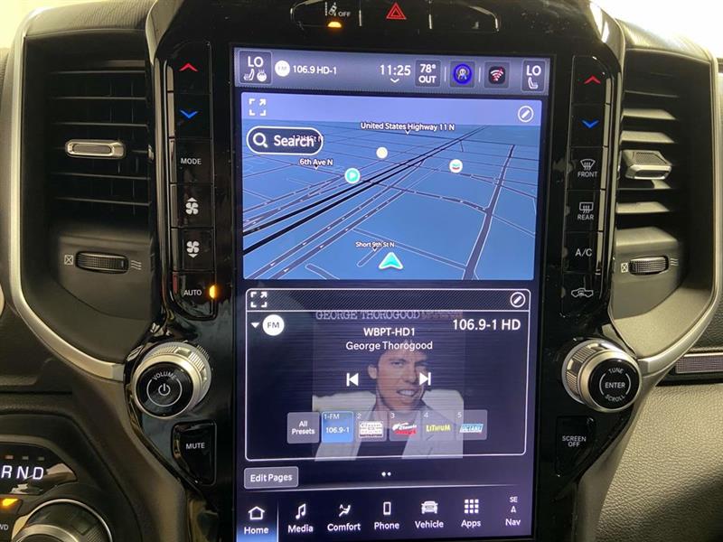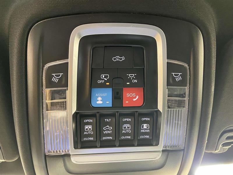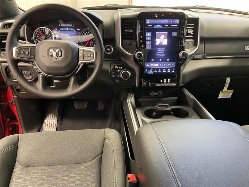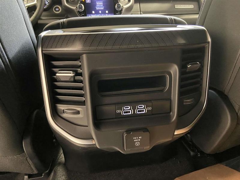 115V Auxiliary Power Outlet, 115V Auxiliary Rear Power Outlet, 12" Touchscreen Display, 2nd Row In Floor Storage Bins, 3 Rear Seat Head Restraints, 3.21 Rear Axle Ratio, 3.92 Rear Axle Ratio, 33 Gallon Fuel Tank, 4 Way Front Headrests, 4-Wheel Disc Brakes, 400W Inverter, 4G LTE Wi-Fi Hot Spot, 6 Speakers, 9 Amplified Speakers w/Subwoofer, ABS brakes, Accent Color Door Handles, Accent Color Premium Power Mirrors, Accent Color Tailgate Handle, Air Conditioning, Air Conditioning ATC w/Dual Zone Control, Alloy wheels, AM/FM radio, Anti-Spin Differential Rear Axle, Apple CarPlay, Apple CarPlay/Android Auto, Auto High-beam Headlights, Auto Power-Folding Mirrors, Auto-Dimming Exterior Driver Mirror, Auto-Dimming Rear-View Mirror, Big Horn Level 2 Equipment Group, Black Exterior Mirrors, Black Exterior Truck Badging, Black Headlamp Bezels, Black Interior Accents, Black Painted Exterior Mirrors Caps, Black Premium Power Mirrors, Black Tail Lamp Bezels, Body Color Front Bumper, Body Color Rear Bumper w/Step Pads, Brake assist, Bucket Seats, Bumpers: chrome, Cloth Bench Seat, Cluster 7.0" TFT Color Display, Compass, Configurable Drive Mode, Connected Travel & Traffic Services, Connectivity - US/Canada, Convex Wide-Angle Exterior Mirror Insert, Delay-off headlights, Deluxe Cloth Bucket Seats, Dome Dual LED Reading Lamp, Driver door bin, Dual front impact airbags, Dual front side impact airbags, Dual-Pane Panoramic Sunroof, Electronic Stability Control, Exterior Mirrors Courtesy Lamps, Exterior Mirrors w/Heating Element, Exterior Mirrors w/Supplemental Signals, Front anti-roll bar, Front Center Armrest w/Storage, Front fog lights, Front reading lights, Front Seat Back Map Pockets, Front wheel independent suspension, Full Length Floor Console, Fully automatic headlights, Glove Box Lamp, Google Android Auto, GPS Antenna Input, GPS Navigation, Grille Black Surround Black Mesh, HD Radio, Heated door mirrors, Heated Front Seats, Heated Steering Wheel, Illuminated entry, Integrated Voice Command w/Bluetooth, Leather Wrapped Steering Wheel, LED Dome Lamp w/On/Off Switch, LED Footwell Lighting, Low tire pressure warning, Manual Adjust 4-Way Front Passenger Seat, Manual Folding Exterior Mirrors, Media Hub w/2 Charge Only USBs, Mopar Black Tubular Side Steps, MOPAR Front & Rear Rubber Floor Mats, Night Edition, Occupant sensing airbag, Outside temperature display, Overhead airbag, Overhead console, Overhead LED Lamps, Panic alarm, ParkView Rear Back-Up Camera, Passenger door bin, Passenger vanity mirror, Power 2-Way Driver Lumbar Adjust, Power Adjust 8-Way Driver Seat, Power Adjustable Pedals, Power door mirrors, Power steering, Power windows, Premium Overhead Console, Quick Order Package 21Z Big Horn, Radio data system, Radio: Uconnect 5 Nav w/12.0" Display, Radio: Uconnect 5 W w/8.4" Display, RAM Grille Badge - Black, RAM Grille Badge - Chrome, Rear 60/40 Folding Seat, Rear anti-roll bar, Rear Center Armrest, Rear Power Sliding Window, Rear seat center armrest, Rear step bumper, Rear Underseat Compartment Storage, Rear Window Defroster, Remote keyless entry, Remote Tailgate Release, Security Alarm, SiriusXM w/360L, Speed control, Split folding rear seat, Steering Wheel Mounted Audio Controls, Sun Visors w/Illuminated Vanity Mirrors, Supplier Part Tracking (J-1), Tachometer, Telescoping steering wheel, Tilt steering wheel, Traction control, Trailer Brake Control, Trip computer, Universal Garage Door Opener, USB Host Flip, Variably intermittent wipers, Voltmeter, Wheels: 18" x 8" Cast-Aluminum Painted, Wheels: 20" x 9.0" Aluminum Painted Clad.