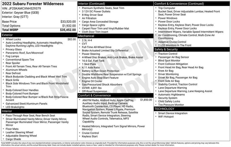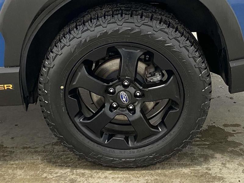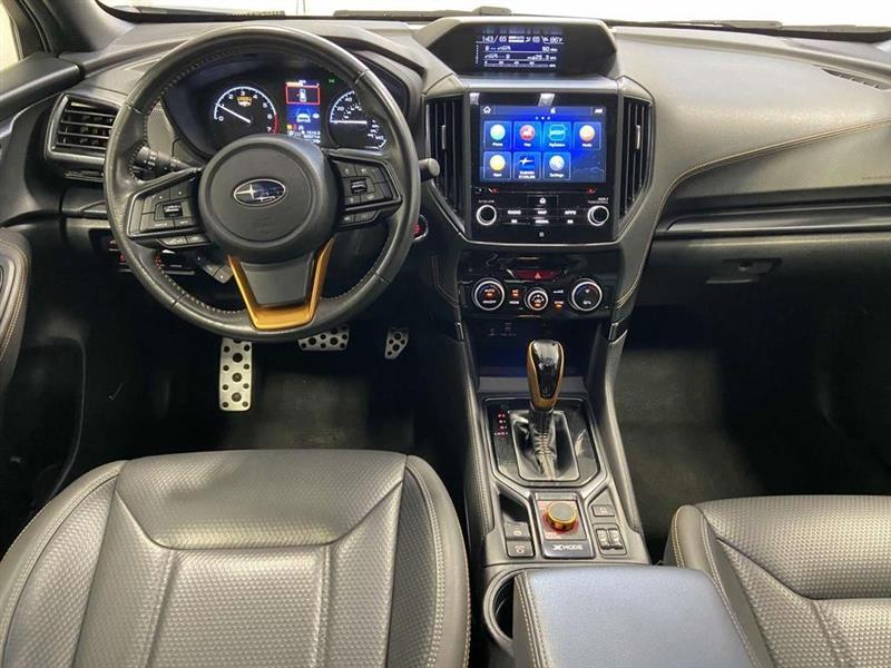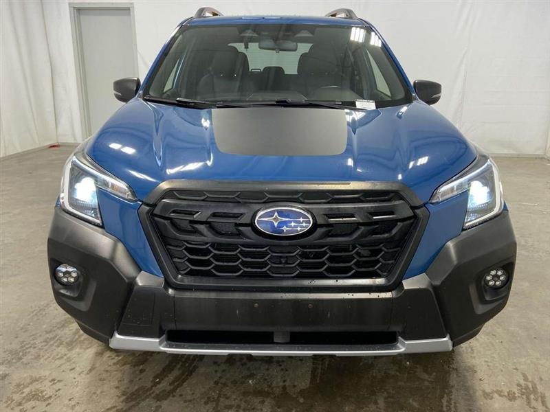 4-Wheel Disc Brakes, 4.11 Axle Ratio, 6 Speakers, ABS brakes, Air Conditioning, Alloy Wheel Locks, Alloy wheels, AM/FM radio: SiriusXM, Anti-whiplash front head restraints, Audio System & Navigation & Power Rr Gate, Auto High-beam Headlights, Automatic temperature control, Brake assist, Bumpers: body-color, CD player, Driver door bin, Driver vanity mirror, Dual front impact airbags, Dual front side impact airbags, Electronic Stability Control, Emergency communication system: STARLINK Safety and Security (Subscription Required), Exterior Parking Camera Rear, Four wheel independent suspension, Front anti-roll bar, Front Bucket Seats, Front Center Armrest, Front dual zone A/C, Front fog lights, Front reading lights, Fully automatic headlights, harman/kardon 576W Amp & Speaker System, Heated door mirrors, Heated Front Bucket Seats, Heated front seats, Illuminated entry, Knee airbag, Leather Shift Knob, Low tire pressure warning, Navigation System, Occupant sensing airbag, Outside temperature display, Overhead airbag, Overhead console, Panic alarm, Passenger door bin, Passenger vanity mirror, Power door mirrors, Power driver seat, Power moonroof: Panoramic, Power Rear Gate, Power steering, Power windows, Radio data system, Radio: Subaru Starlink 8.0" Multimedia Nav System, Radio: Subaru Starlink 8.0" Multimedia Plus System, Rear anti-roll bar, Rear seat center armrest, Rear window defroster, Rear window wiper, Remote keyless entry, Roof rack: rails only, Security system, Speed control, Speed-sensing steering, Split folding rear seat, Spoiler, STARLINK/Apple CarPlay/Android Auto, Steering wheel mounted audio controls, Tachometer, Telescoping steering wheel, Textured StarTex Upholstery, Tilt steering wheel, Traction control, Trip computer, Turn signal indicator mirrors, Variably intermittent wipers, Wheels: 17" x 7.0J Matte Black Machine Finish Alloy. Geyser Blue 2022 Subaru Forester Wilderness Lineartronic CVT 2.5L 4-Cylinder DOHC 16V AWD