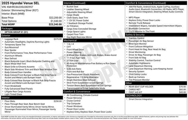 Shimmering Silver 2025 Hyundai Venue SEL FWD CVT I4 4-Wheel Disc Brakes, 6 Speakers, 6.5J x 17" Alloy Wheels, ABS brakes, Air Conditioning, All-Season Fitted Liners, Alloy wheels, AM/FM radio, Apple CarPlay & Android Auto, Auto High-beam Headlights, Automatic temperature control, Brake assist, Bumpers: body-color, Cargo Net, Carpeted Floor Mats, Cloth Seat Trim, Crossbar Kit, Delay-off headlights, Driver door bin, Driver vanity mirror, Dual front impact airbags, Dual front side impact airbags, Electronic Stability Control, First Aid Kit, Front anti-roll bar, Front Bucket Seats, Front Center Armrest, Front reading lights, Front wheel independent suspension, Fully automatic headlights, Illuminated entry, Leather Shift Knob, Leather steering wheel, Low tire pressure warning, Occupant sensing airbag, Option Group 01, Outside temperature display, Overhead airbag, Overhead console, Panic alarm, Passenger door bin, Passenger vanity mirror, Power door mirrors, Power moonroof, Power steering, Power windows, Radio: AM/FM/HD Display Audio, Rear Seat Cup Holder, Rear window defroster, Rear window wiper, Remote keyless entry, Security system, Speed control, Speed-sensing steering, Split folding rear seat, Spoiler, Steering wheel mounted audio controls, Tachometer, Telescoping steering wheel, Tilt steering wheel, Traction control, Trip computer, Variably intermittent wipers.