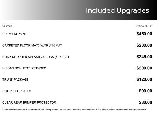 CVT with Xtronic, Charcoal Cloth, 16" Alloy Wheels, 4-Wheel Disc Brakes, 8 Speakers, ABS brakes, Air Conditioning, Alloy wheels, AM/FM radio: SiriusXM, Auto High-beam Headlights, Blind Spot Warning, Brake assist, Bumpers: body-color, Delay-off headlights, Driver door bin, Driver vanity mirror, Dual front impact airbags, Dual front side impact airbags, Electronic Stability Control, Four wheel independent suspension, Front anti-roll bar, Front Bucket Seats, Front Center Armrest, Front reading lights, Fully automatic headlights, Illuminated entry, Knee airbag, Low tire pressure warning, NissanConnect featuring Apple CarPlay and Android Auto, Occupant sensing airbag, Outside temperature display, Overhead airbag, Overhead console, Panic alarm, Passenger door bin, Passenger vanity mirror, Power door mirrors, Power steering, Power windows, Radio data system, Radio: AM/FM w/RDS/MP3/Aux-In, Rear anti-roll bar, Rear Parking Sensors, Rear side impact airbag, Rear window defroster, Remote keyless entry, Security system, Speed control, Speed-sensing steering, Split folding rear seat, Steering wheel mounted audio controls, Tachometer, Telescoping steering wheel, Tilt steering wheel, Traction control, Trip computer, Upgraded Cloth Seat Trim, Variably intermittent wipers, CVT with Xtronic, Charcoal Cloth.
