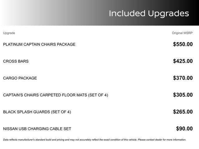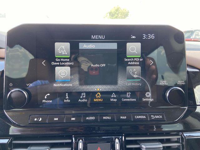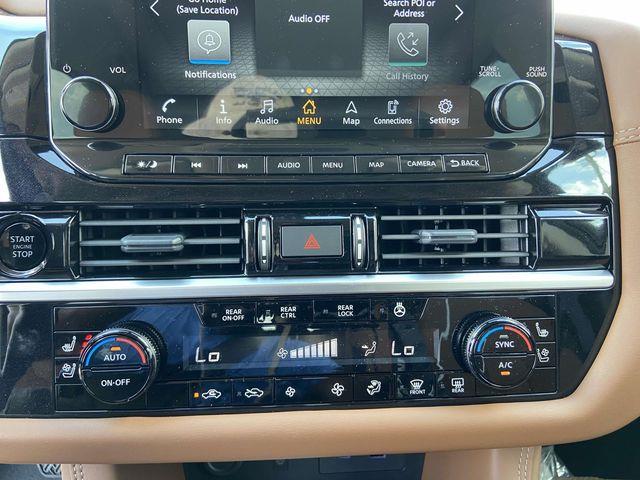 13 Speakers, 3rd row seats: bench, 4-Wheel Disc Brakes, ABS brakes, Air Conditioning, Alloy wheels, AM/FM radio: SiriusXM, Auto High-beam Headlights, Auto tilt-away steering wheel, Auto-dimming Rear-View mirror, Automatic temperature control, Bodyside moldings, Bose Premium Audio System, Brake assist, Bumpers: body-color, Climate Controlled Front Bucket Seats, Delay-off headlights, Driver door bin, Driver vanity mirror, Dual front impact airbags, Dual front side impact airbags, Electronic Stability Control, Emergency communication system, Exterior Parking Camera Rear, Four wheel independent suspension, Front anti-roll bar, Front Bucket Seats, Front Center Armrest, Front dual zone A/C, Front reading lights, Fully automatic headlights, Garage door transmitter: HomeLink, Heads-Up Display, Heated door mirrors, Heated front seats, Heated rear seats, Heated steering wheel, Illuminated entry, Knee airbag, Leather steering wheel, Low tire pressure warning, Memory seat, Navigation system: NissanConnect with Navigation and Services, NissanConnect featuring Apple CarPlay and Android Auto, NissanConnect w/Navigation & Services, Occupant sensing airbag, Outside temperature display, Overhead airbag, Overhead console, Panic alarm, Passenger door bin, Passenger vanity mirror, Power door mirrors, Power driver seat, Power Liftgate, Power moonroof, Power passenger seat, Power steering, Power windows, Radio data system, Radio: AM/FM Audio System, Rain sensing wipers, Rear air conditioning, Rear anti-roll bar, Rear reading lights, Rear seat center armrest, Rear side impact airbag, Rear window defroster, Rear window wiper, Reclining 3rd row seat, Remote keyless entry, Security system, Semi-Aniline Leather-Appointed Seating Surfaces, Speed control, Speed-sensing steering, Speed-Sensitive Wipers, Split folding rear seat, Spoiler, Steering wheel memory, Steering wheel mounted audio controls, Tachometer, Telescoping steering wheel, Tilt steering wheel, Traction control, Trip computer, Turn signal indicator mirrors, Variably intermittent wipers, Ventilated front seats, Wheels: 20" x 8J Machined Alloy.