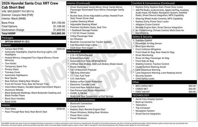 3.51 Axle Ratio, 4-Wheel Disc Brakes, 6 Speakers, ABS brakes, Air Conditioning, All Season Fitted Liners, Alloy wheels, AM/FM radio: SiriusXM, Apple CarPlay & Android Auto, Auto High-beam Headlights, Auto-leveling suspension, Automatic temperature control, Bed Cargo Net, Bodyside moldings, Brake assist, Bumpers: body-color, Cargo Net, Carpeted Floor Mats, Compass, Delay-off headlights, Driver door bin, Driver vanity mirror, Dual front impact airbags, Dual front side impact airbags, Electronic Stability Control, Emergency communication system: Bluelink+, Exterior Parking Camera Rear, First Aid Kit, Four wheel independent suspension, Front anti-roll bar, Front Bucket Seats, Front Center Armrest, Front dual zone A/C, Front reading lights, Fully automatic headlights, H-Tex Leatherette Seat Trim, Heated door mirrors, Heated Front Bucket Seats, Heated front seats, Illuminated entry, Leather Shift Knob, Leather steering wheel, Low tire pressure warning, Navigation System, Occupant sensing airbag, Option Group 01, Outside temperature display, Overhead airbag, Overhead console, Panic alarm, Passenger door bin, Passenger vanity mirror, Power door mirrors, Power driver seat, Power steering, Power windows, Radio data system, Radio: AM/FM/HD Audio System, Rear anti-roll bar, Rear reading lights, Rear side impact airbag, Rear step bumper, Rear window defroster, Remote keyless entry, Security system, Speed control, Speed-sensing steering, Split folding rear seat, Spoiler, Steering wheel mounted audio controls, Tachometer, Telescoping steering wheel, Tilt steering wheel, Traction control, Trip computer, Turn signal indicator mirrors, Variably intermittent wipers, Wheels: 18" x 7.5J Alloy w/XRT-Exclusive Design.