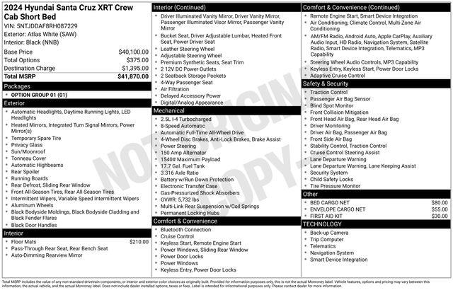 Santa Cruz XRT, Hyundai Certified Used Vehicles Certified, 4D Crew Cab, Shiftronic, AWD, Atlas White, Navigation System, Option Group 01, 18" x 7.5J Alloy Wheels, 3.316 Axle Ratio, 4-Wheel Disc Brakes, 6 Speakers, ABS brakes, Air Conditioning, Alloy wheels, AM/FM radio: SiriusXM, Apple CarPlay & Android Auto, Auto High-beam Headlights, Auto-dimming Rear-View mirror, Auto-leveling suspension, Automatic temperature control, Bed Cargo Net, Bodyside moldings, Brake assist, Bumpers: body-color, Carpeted Floor Mats, Delay-off headlights, Driver door bin, Driver vanity mirror, Dual front impact airbags, Dual front side impact airbags, Electronic Stability Control, Emergency communication system: Bluelink+, Envelope Cargo Net, Exterior Parking Camera Rear, First Aid Kit, Four wheel independent suspension, Front anti-roll bar, Front Bucket Seats, Front Center Armrest, Front dual zone A/C, Front reading lights, Fully automatic headlights, H-Tex Leatherette Seating Surfaces, Heated door mirrors, Heated Front Bucket Seats, Heated front seats, Illuminated entry, Leather Shift Knob, Leather steering wheel, Low tire pressure warning, Occupant sensing airbag, Outside temperature display, Overhead airbag, Overhead console, Panic alarm, Passenger door bin, Passenger vanity mirror, Power door mirrors, Power driver seat, Power moonroof, Power steering, Power windows, Radio data system, Radio: AM/FM/HD Audio System, Rear anti-roll bar, Rear side impact airbag, Rear step bumper, Rear window defroster, Remote keyless entry, Security system, Speed control, Speed-sensing steering, Split folding rear seat, Spoiler, Steering wheel mounted audio controls, Tachometer, Telescoping steering wheel, Tilt steering wheel, Traction control, Trip computer, Turn signal indicator mirrors, Variably intermittent wipers, Santa Cruz XRT, 4D Crew Cab, Shiftronic, AWD, Atlas White, Navigation System, Option Group 01. Atlas White 2024 Hyundai Santa Cruz XRT AWD Shiftronic 2.5L I4