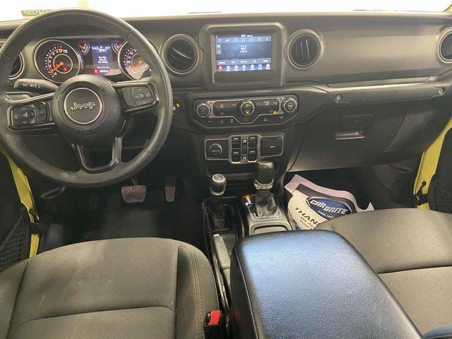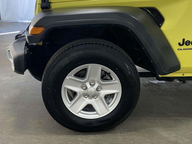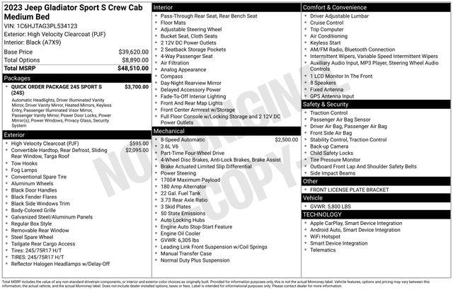 3.73 Rear Axle Ratio, 4-Wheel Disc Brakes, 4G LTE Wi-Fi Hot Spot, 8 Speakers, ABS brakes, Air Conditioning, AM/FM radio, Apple CarPlay, Apple CarPlay/Android Auto, Automatic Headlamps, Black 3-Piece Hard Top, Brake assist, Cloth Low-Back Bucket Seats, Compass, Deep Tint Sunscreen Windows, Delay-off headlights, Driver door bin, Driver vanity mirror, Dual front impact airbags, Dual front side impact airbags, Electronic Stability Control, Emergency communication system, Freedom Panel Storage Bag, Front 1-Touch Down Power Windows, Front anti-roll bar, Front Bucket Seats, Front Center Armrest w/Storage, Front fog lights, Front License Plate Bracket, Front reading lights, Google Android Auto, GPS Antenna Input, Integrated Center Stack Radio, Integrated roll-over protection, Integrated Voice Command w/Bluetooth, Low tire pressure warning, Normal Duty Plus Suspension, Normal Duty Suspension, Occupant sensing airbag, Outside temperature display, ParkView Rear Back-Up Camera, Passenger door bin, Passenger vanity mirror, Power Heated Mirrors, Power steering, Power Tailgate Lock, Premium Wrapped Steering Wheel, Quick Order Package 24S Sport S, Radio data system, Radio: Uconnect 4 w/7" Display, Rear anti-roll bar, Rear reading lights, Rear Sliding Window, Rear Window Defroster, Remote Keyless Entry, Security Alarm, Speed control, Speed Sensitive Power Locks, Split folding rear seat, Sport S, Steering wheel mounted audio controls, Sun Visors w/Illuminated Vanity Mirrors, Tachometer, Telescoping steering wheel, Tilt steering wheel, Traction control, Trip computer, USB Host Flip, Variably intermittent wipers, Wheels: 17" x 7.5 Tech Silver Aluminum, Wheels: 17" x 7.5" Black Steel Styled, Wheels: 17" x 7.5" Tech Silver Aluminum (DISC). High Velocity Clearcoat 2023 Jeep Gladiator Sport 8-Speed Automatic 3.6L V6 24V VVT 4WD