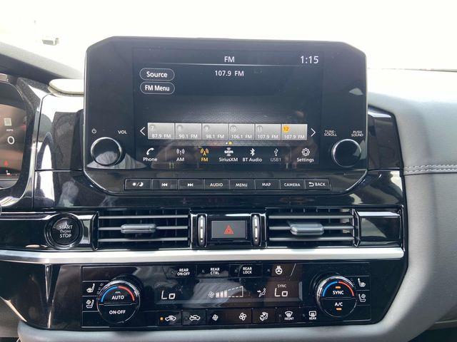 13 Speakers, 3rd row seats: bench, 4-Wheel Disc Brakes, ABS brakes, Air Conditioning, Alloy wheels, AM/FM radio: SiriusXM, Auto High-beam Headlights, Auto tilt-away steering wheel, Auto-dimming Rear-View mirror, Automatic temperature control, Bodyside moldings, Bose Premium Audio System, Brake assist, Bumpers: body-color, Climate Controlled Front Bucket Seats, Delay-off headlights, Driver door bin, Driver vanity mirror, Dual front impact airbags, Dual front side impact airbags, Electronic Stability Control, Emergency communication system, Exterior Parking Camera Rear, Four wheel independent suspension, Front anti-roll bar, Front Bucket Seats, Front Center Armrest, Front dual zone A/C, Front reading lights, Fully automatic headlights, Garage door transmitter: HomeLink, Heads-Up Display, Heated door mirrors, Heated front seats, Heated rear seats, Heated steering wheel, Illuminated entry, Knee airbag, Leather steering wheel, Low tire pressure warning, Memory seat, Navigation system: NissanConnect with Navigation and Services, NissanConnect featuring Apple CarPlay and Android Auto, NissanConnect w/Navigation & Services, Occupant sensing airbag, Outside temperature display, Overhead airbag, Overhead console, Panic alarm, Passenger door bin, Passenger vanity mirror, Power door mirrors, Power driver seat, Power Liftgate, Power moonroof, Power passenger seat, Power steering, Power windows, Radio data system, Radio: AM/FM Audio System, Rain sensing wipers, Rear air conditioning, Rear anti-roll bar, Rear reading lights, Rear seat center armrest, Rear side impact airbag, Rear window defroster, Rear window wiper, Reclining 3rd row seat, Remote keyless entry, Security system, Semi-Aniline Leather-Appointed Seating Surfaces, Speed control, Speed-sensing steering, Speed-Sensitive Wipers, Split folding rear seat, Spoiler, Steering wheel memory, Steering wheel mounted audio controls, Tachometer, Telescoping steering wheel, Tilt steering wheel, Traction control, Trip computer, Turn signal indicator mirrors, Variably intermittent wipers, Ventilated front seats, Wheels: 20" x 8J Machined Alloy.