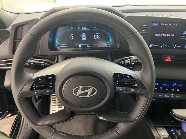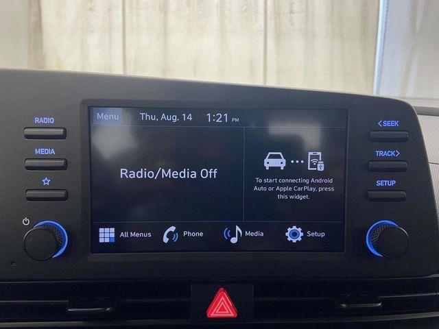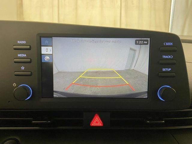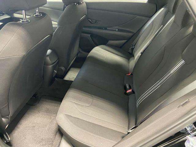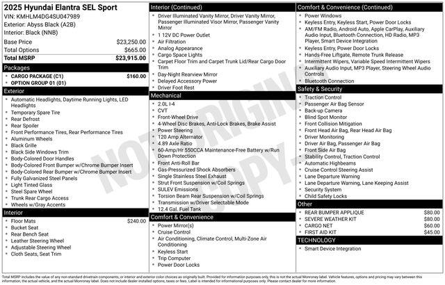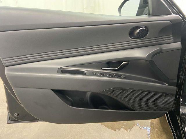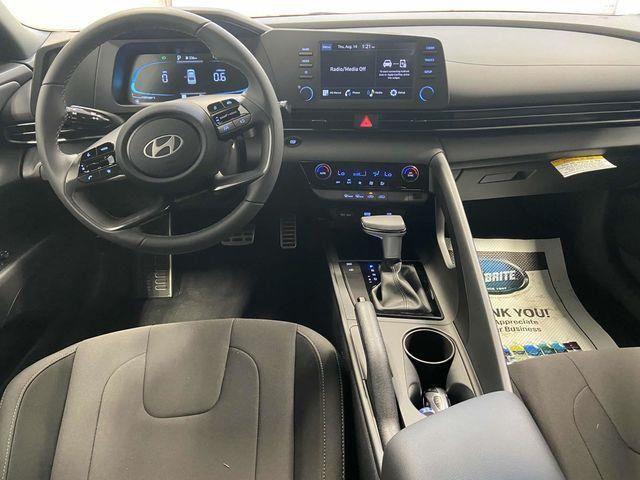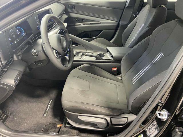 17" x 7.0J Alloy Wheels, 4-Wheel Disc Brakes, 6 Speakers, ABS brakes, Air Conditioning, Alloy wheels, AM/FM radio, Apple CarPlay & Android Auto, Auto High-beam Headlights, Automatic temperature control, Brake assist, Bumpers: body-color, Cargo Blocks, Cargo Net, Cargo Package, Carpeted Floor Mats, Delay-off headlights, Driver door bin, Driver vanity mirror, Dual front impact airbags, Dual front side impact airbags, Electronic Stability Control, Exterior Parking Camera Rear, First Aid Kit, Front anti-roll bar, Front Bucket Seats, Front Center Armrest, Front dual zone A/C, Front reading lights, Front wheel independent suspension, Fully automatic headlights, Illuminated entry, Leather Shift Knob, Leather steering wheel, Low tire pressure warning, Occupant sensing airbag, Option Group 01, Outside temperature display, Overhead airbag, Overhead console, Panic alarm, Passenger door bin, Passenger vanity mirror, Power door mirrors, Power steering, Power windows, Premium Cloth Seat Trim, Radio: AM/FM/HD Display Audio, Rear Bumper Applique, Rear side impact airbag, Rear window defroster, Remote keyless entry, Reversible Cargo Tray, Security system, Severe Weather Kit, Speed control, Speed-sensing steering, Spoiler, Steering wheel mounted audio controls, Tachometer, Telescoping steering wheel, Tilt steering wheel, Traction control, Trip computer, Variably intermittent wipers. Abyss Black 2025 Hyundai Elantra SEL Sport CVT I4 FWD