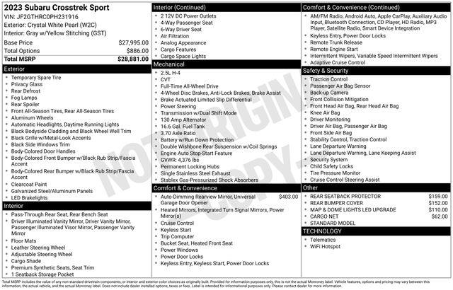 This 2023 Subaru Crosstrek Sport is powered by a 2.5L 4-Cylinder BOXER engine that delivers 182 horsepower, with an impressive EPA-estimated 27 city / 34 highway MPG.