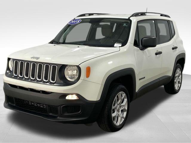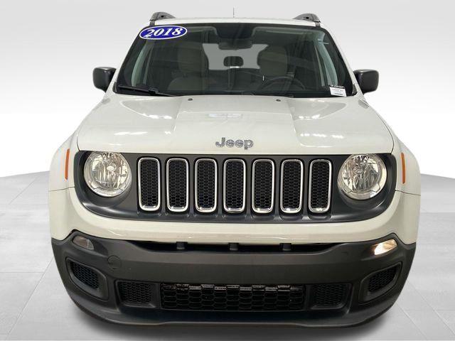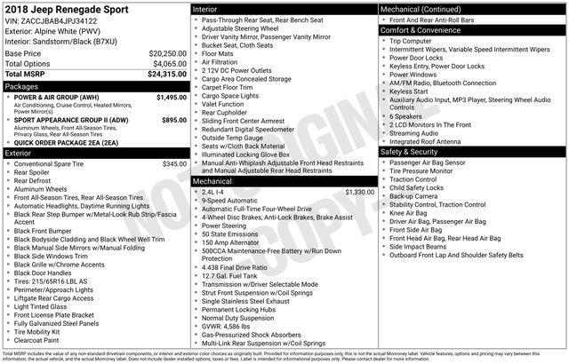 16" x 6.5" Styled Steel Wheels, 17" x 7.0" Aluminum Wheels, 4-Wheel Disc Brakes, 6 Speakers, ABS brakes, Air Conditioning, AM/FM radio, Anti-whiplash front head restraints, Black Side Roof Rails, Brake assist, Cloth Low-Back Bucket Seats, Compass, Deep Tint Sunscreen Glass, Delay-off headlights, Driver door bin, Driver vanity mirror, Dual front impact airbags, Dual front side impact airbags, Electronic Stability Control, Four wheel independent suspension, Front anti-roll bar, Front Bucket Seats, Front Center Armrest, Front reading lights, Illuminated entry, Knee airbag, Low tire pressure warning, Normal Duty Suspension, Occupant sensing airbag, Outside temperature display, Overhead airbag, Overhead console, Panic alarm, ParkView Rear Back-Up Camera, Passenger door bin, Passenger vanity mirror, Power & Air Group, Power Heated Mirrors, Power steering, Power windows, Quick Order Package 2EA, Radio data system, Radio: Uconnect 3 w/5" Display, Rear anti-roll bar, Rear window defroster, Rear window wiper, Remote keyless entry, Speed Control, Split folding rear seat, Spoiler, Sport Appearance Group II, Steering wheel mounted audio controls, Tachometer, Telescoping steering wheel, Tilt steering wheel, Traction control, Trip computer, Variably intermittent wipers, Voltmeter. Alpine White 2018 Jeep Renegade Sport 9-Speed 948TE Automatic 2.4L I4 4WD
