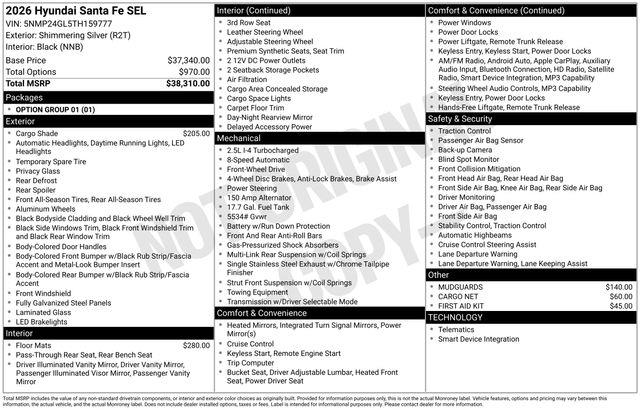 Shimmering Silver Pearl 2026 Hyundai Santa Fe SEL FWD 8-Speed Automatic with SHIFTRONIC 2.5L I4