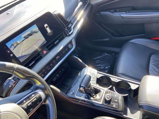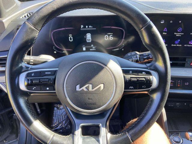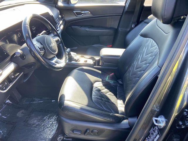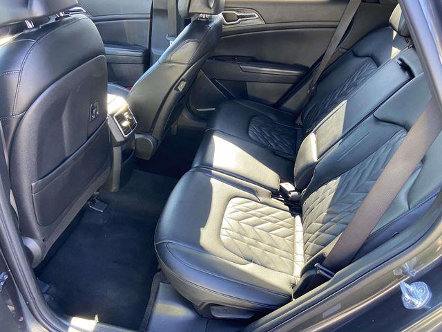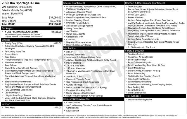 AWD, 4-Wheel Disc Brakes, 6 Speakers, ABS brakes, Air Conditioning, Alloy wheels, AM/FM radio: SiriusXM, Apple CarPlay & Android Auto, Auto High-beam Headlights, Automatic temperature control, Axle Ratio: 3.648, Brake assist, Bumpers: body-color, Carpet Floor Mats X-Line, Compass, Delay-off headlights, Driver door bin, Driver vanity mirror, Dual front impact airbags, Dual front side impact airbags, Electronic Stability Control, Emergency communication system, Four wheel independent suspension, Front anti-roll bar, Front Bucket Seats, Front Center Armrest, Front dual zone A/C, Fully automatic headlights, harman/kardon® Speakers, Heated door mirrors, Heated Front Bucket Seats, Heated front seats, Illuminated entry, Leather Shift Knob, Leather steering wheel, LED Interior Lighting, Low tire pressure warning, Navigation System, Occupant sensing airbag, Outside temperature display, Overhead airbag, Overhead console, Panic alarm, Panoramic Sunroof, Passenger door bin, Passenger vanity mirror, Power door mirrors, Power driver seat, Power steering, Power windows, Premium Leatherette Seat Trim, Radio: AM/FM/HD Audio System, Rain sensing wipers, Rear anti-roll bar, Rear seat center armrest, Rear window defroster, Rear window wiper, Remote keyless entry, Security system, Smart Power Liftgate, Speed control, Speed-sensing steering, Split folding rear seat, Spoiler, Steering wheel mounted audio controls, Tachometer, Telescoping steering wheel, Tilt steering wheel, Traction control, Trip computer, Turn signal indicator mirrors, Variably intermittent wipers, Wheels: 19" Gloss Black Alloy, X-Line Premium Package, AWD. Gravity Gray 2023 Kia Sportage X-Line 8-Speed Automatic I4 AWD