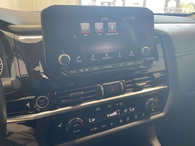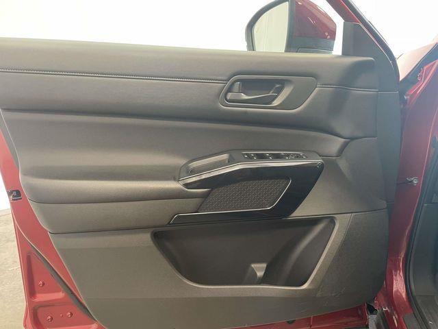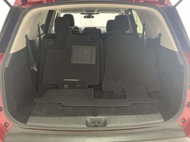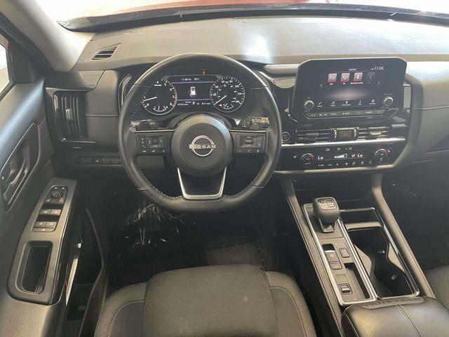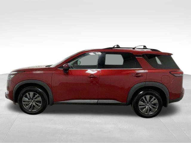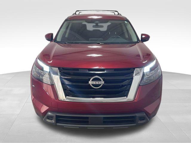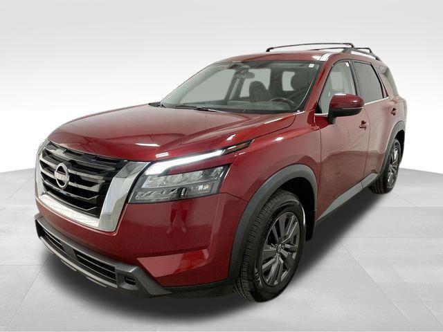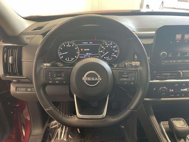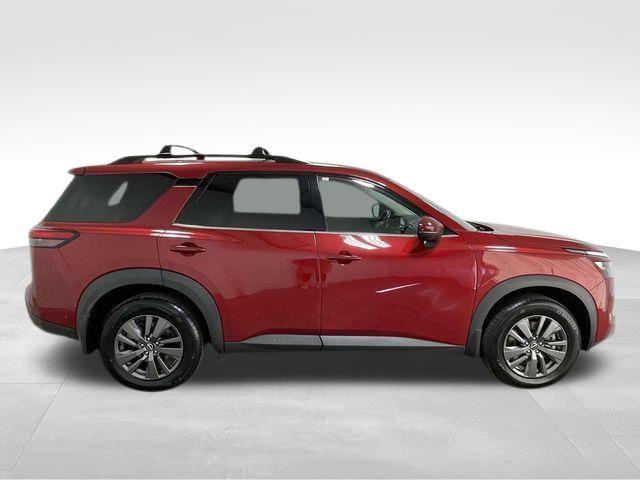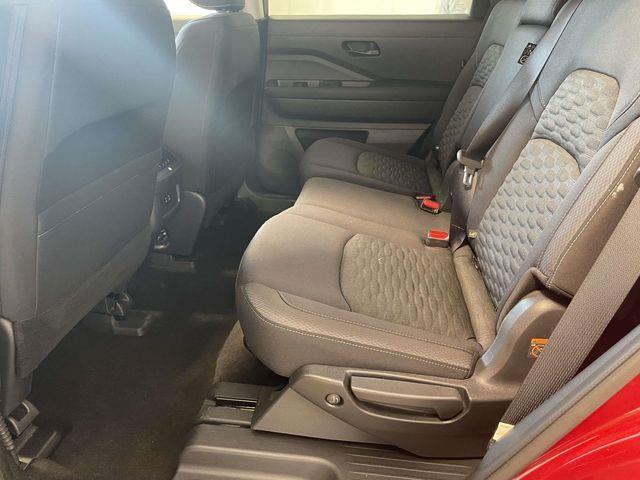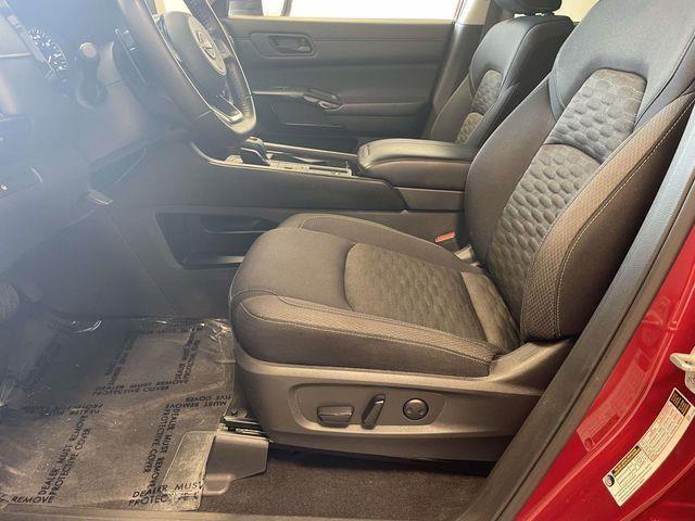 Nissan Certified Certified, 18" Painted Alloy Wheels, 3rd row seats: bench, 4-Wheel Disc Brakes, 6 Speakers, ABS brakes, Air Conditioning, Alloy wheels, AM/FM radio: SiriusXM, Auto High-beam Headlights, Automatic temperature control, Axle Ratio: 4.334, Bench Seat Carpeted Floor Mats (Set of 4), Black Splash Guards (Set of 4), Brake assist, Bumpers: body-color, Cloth Seating Surfaces, Cross Bars, Delay-off headlights, Driver door bin, Driver vanity mirror, Dual front impact airbags, Dual front side impact airbags, Electronic Stability Control, Emergency communication system: NissanConnect Services, Four wheel independent suspension, Front anti-roll bar, Front Bucket Seats, Front Center Armrest, Front dual zone A/C, Front reading lights, Fully automatic headlights, Heated door mirrors, Heated Front Bucket Seats, Heated front seats, Illuminated entry, Knee airbag, Leather steering wheel, Low tire pressure warning, NissanConnect featuring Apple CarPlay and Android Auto, Occupant sensing airbag, Outside temperature display, Overhead airbag, Overhead console, Panic alarm, Passenger door bin, Passenger vanity mirror, Power door mirrors, Power driver seat, Power steering, Power windows, Radio data system, Radio: AM/FM Audio System w/NissanConnect, Rear air conditioning, Rear anti-roll bar, Rear Parking Sensors, Rear reading lights, Rear seat center armrest, Rear side impact airbag, Rear window defroster, Rear window wiper, Reclining 3rd row seat, Remote keyless entry, Security system, Speed control, Speed-sensing steering, Split folding rear seat, Spoiler, Steering wheel mounted audio controls, Tachometer, Telescoping steering wheel, Tilt steering wheel, Traction control, Trip computer, Turn signal indicator mirrors, Variably intermittent wipers. Scarlet Ember Tintcoat 2023 Nissan Pathfinder SV FWD 9-Speed Automatic V6