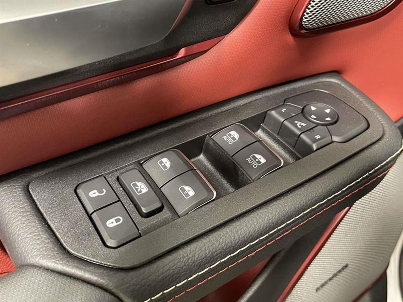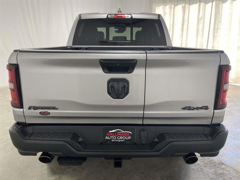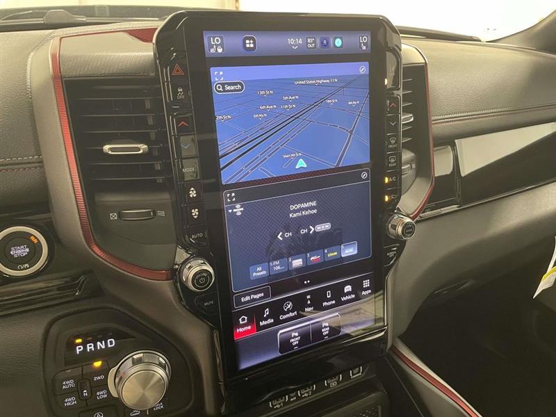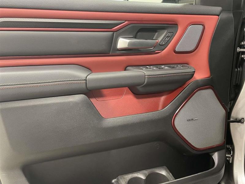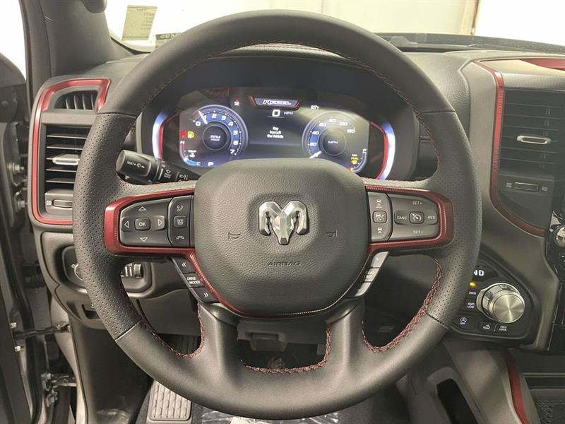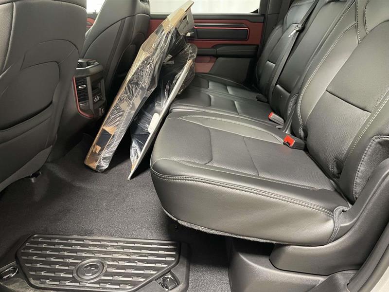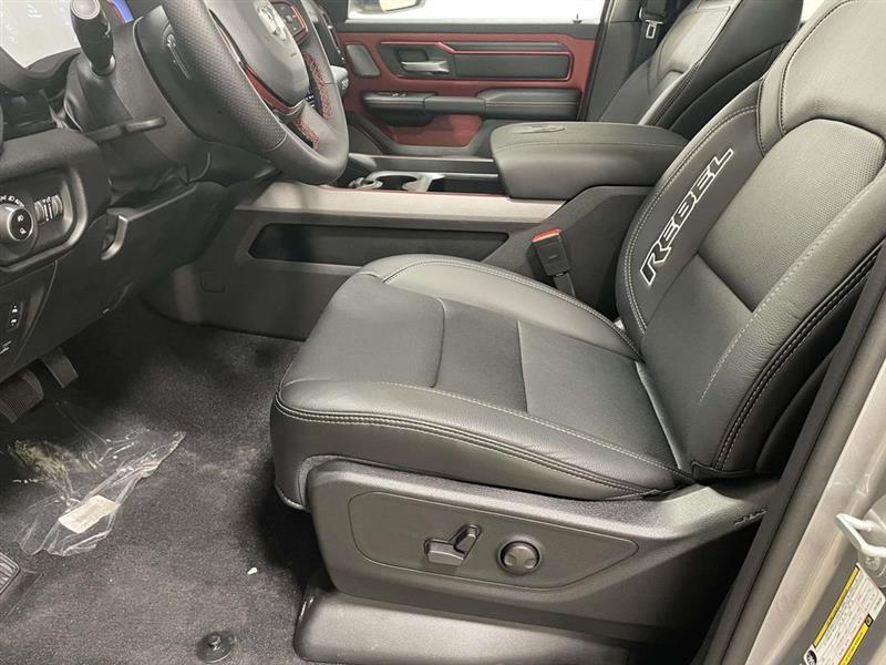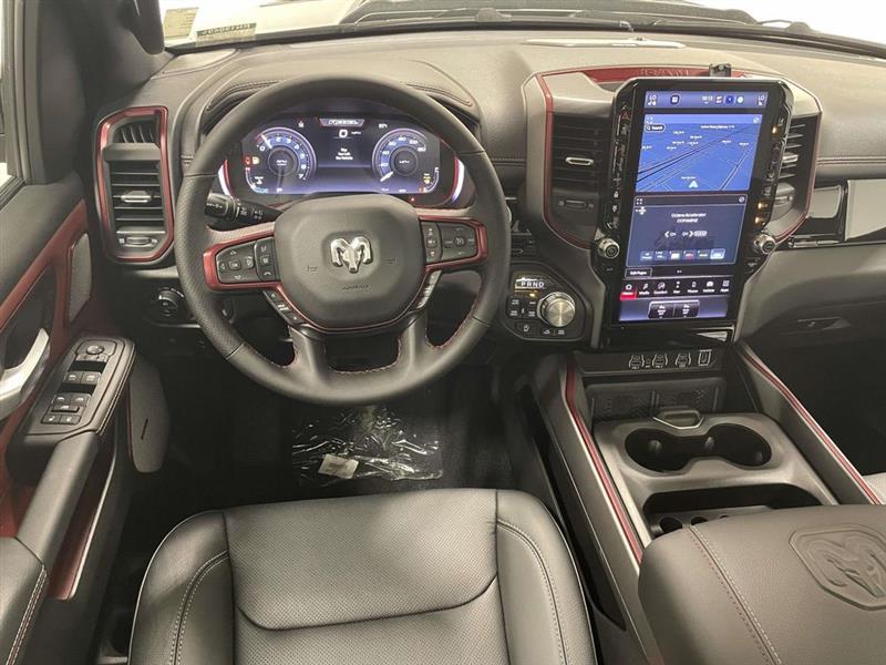 10 Speakers, 115V Auxiliary Rear Power Outlet, 14.4" Touchscreen Display, 2-Door Passive Entry, Front Door Locks, 3.92 Rear Axle Ratio, 4 Way Front Headrests, 4-Wheel Disc Brakes, 4G LTE Wi-Fi Hot Spot, ABS brakes, Accent Color Door Handles, Accent Color Premium Power Mirrors, Accent Color Tailgate Handle, Air Conditioning, Alloy wheels, AM/FM radio: SiriusXM with 360L, Apple CarPlay, Apple CarPlay/Android Auto, Auto High-beam Headlights, Auto Power-Folding Mirrors, Auto-Dimming Exterior Driver Mirror, Auto-dimming Rear-View mirror, Automatic temperature control, Bed Utility Group, Black Exterior Mirrors, Black Painted Exterior Mirrors Caps, Brake assist, Bucket Seats, Cloth/Vinyl Bucket Seats, Compass, Connected Travel & Traffic Services, Connectivity - US/Canada, Convex Wide-Angle Exterior Mirror Insert, Delay-off headlights, Disassociated Touchscreen Display, Dome Dual LED Reading Lamp, Driver door bin, Driver Seat Memory, Driver vanity mirror, Dual front impact airbags, Dual front side impact airbags, Dual Wireless Charging Pad, Dual-Pane Panoramic Sunroof, Electronic Stability Control, Exterior 115V AC Outlet, Exterior Mirrors Approach Lamps, Exterior Mirrors Courtesy Lamps, Exterior Mirrors w/Heating Element, Exterior Mirrors w/Memory, Exterior Mirrors w/Supplemental Signals, Front anti-roll bar, Front Bucket Seats, Front Center Armrest w/Storage, Front dual zone A/C, Front fog lights, Front License Plate Bracket, Front Passenger Interactive Display, Front reading lights, Front Seat Back Map Pockets, Front wheel independent suspension, Full Length Upgraded Floor Console, Fully automatic headlights, Garage door transmitter, Global Telematics Box Module (TBM), Google Android Auto, GPS Antenna Input, GPS Navigation, harman/kardon 19 Speaker Premium Sound, HD Radio, Heated door mirrors, Heated Front Seats, Heated front seats, Heated Second Row Seats, Heated Steering Wheel, Heated steering wheel, Illuminated entry, Integrated Center Stack Radio, Integrated Voice Command w/Bluetooth, Leather steering wheel, Low tire pressure warning, Manual Folding Exterior Mirrors, Media Hub w/2 Charge Only USBs, MOPAR 4 Adjustable Cargo Tie-Down Hooks, MOPAR Spray In Bedliner, Multi-Function Tailgate, Navigation System, Occupant sensing airbag, Off-Road Information Pages, Outside temperature display, Overhead airbag, Overhead console, Panic alarm, ParkView Rear Back-Up Camera, Passenger door bin, Passenger vanity mirror, Power 2-Way Driver Lumbar Adjust, Power 2-Way Passenger Lumbar Adjust, Power Adjust 8-Way Driver Seat, Power Adjust 8-Way Front Passenger Seat, Power Adjustable Pedals w/Memory, Power door mirrors, Power driver seat, Power steering, Power Tailgate, Power windows, Proximity Approach/Departure Lamps, Quick Order Package 21W Rebel, Radio data system, Radio: Uconnect 5 Nav w/12.0" Display, Radio: Uconnect 5 Nav w/14.4" Display, Radio/Driver Seat/Mirrors/Pedals Memory, Rain Sensitive Windshield Wipers, RAM's Head Badge, Rear 60/40 Folding Seat, Rear anti-roll bar, Rear seat center armrest, Rear step bumper, Rear Window Defroster, Rebel Level 2 Equipment Group, Remote keyless entry, Security Alarm, SiriusXM Radio Service, SiriusXM w/360L, Smartphone As A Key Capable, Speed control, Split folding rear seat, Steering wheel mounted audio controls, Tachometer, Telescoping steering wheel, Tilt steering wheel, Traction control, Trip computer, USB Host Flip, Variably intermittent wipers, Voltmeter, Wheels: 18" x 8.0" Painted Mid-Gloss Black.
