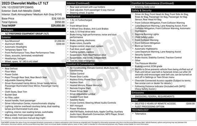 Gray Cloth, 17" Aluminum Wheels, 18" Bright Machined Aluminum Wheels, 4-Wheel Disc Brakes, 6 Speakers, 6-Speaker Audio System Feature, 6-Way Manual Front Passenger Seat Adjuster, 8-Way Power Driver Seat Adjuster, ABS brakes, Air Conditioning, Alloy wheels, AM/FM radio: SiriusXM, Apple CarPlay/Android Auto, Auto High-beam Headlights, Automatic temperature control, Brake assist, Bumpers: body-color, Compass, Delay-off headlights, Deleted 3 Years of Remote Access, Driver door bin, Driver vanity mirror, Dual front impact airbags, Dual front side impact airbags, Electronic Stability Control, Emergency communication system: OnStar and Chevrolet connected services capable, Exterior Parking Camera Rear, Four wheel independent suspension, Front anti-roll bar, Front Bucket Seats, Front Center Armrest, Front dual zone A/C, Front reading lights, Fully automatic headlights, Heated door mirrors, Heated Driver & Front Passenger Seats, Heated front seats, Illuminated entry, Knee airbag, Low tire pressure warning, Occupant sensing airbag, Outside temperature display, Overhead airbag, Overhead console, Panic alarm, Passenger door bin, Passenger vanity mirror, Power door mirrors, Power Driver Lumbar Control Seat Adjuster, Power driver seat, Power steering, Power Tilt-Sliding Sunroof, Power windows, Preferred Equipment Group 1LT, Premium audio system: Chevrolet Infotainment 3 Plus, Premium Cloth Seat Trim, Radio data system, Radio: Chevrolet Infotainment 3 System, Rear anti-roll bar, Rear reading lights, Rear seat center armrest, Rear side impact airbag, Rear window defroster, Remote keyless entry, Security system, SiriusXM Radio, Speed control, Split folding rear seat, Steering wheel mounted audio controls, Tachometer, Telescoping steering wheel, Tilt steering wheel, Traction control, Trip computer, Variably intermittent wipers, Voltmeter, Wireless Apple CarPlay/Android Auto, Gray Cloth. Dark Ash Metallic 2023 Chevrolet Malibu LT 1LT CVT 1.5L DOHC FWD