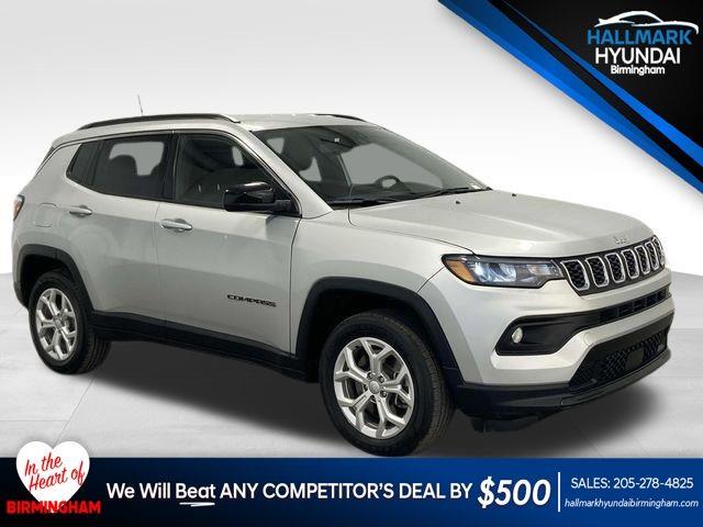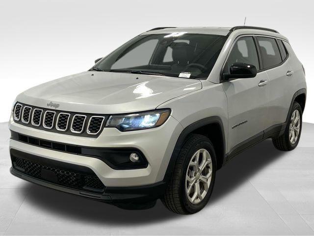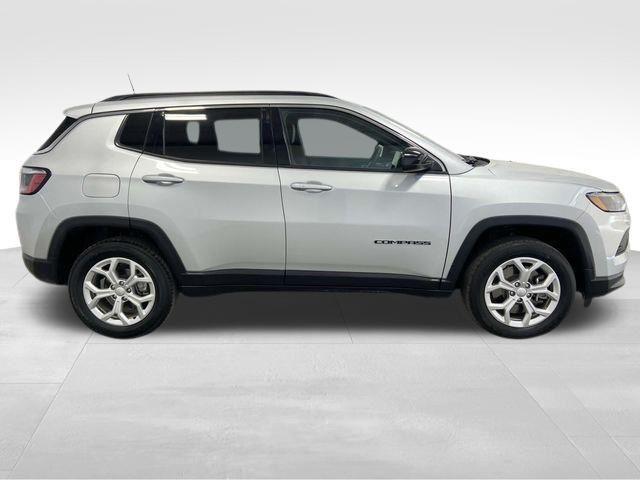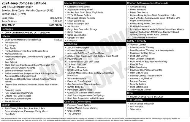 4WD, 17" x 7" Aluminum Wheels, 3.73 Final Drive Ratio, 4-Wheel Disc Brakes, 6 Speakers, ABS brakes, Air Conditioning, Alloy wheels, AM/FM radio: SiriusXM, Auto High-beam Headlights, Brake assist, Bumpers: body-color, Compass, Delay-off headlights, Driver door bin, Driver vanity mirror, Dual front impact airbags, Dual front side impact airbags, Electronic Stability Control, Emergency communication system: Jeep Connect, Four wheel independent suspension, Front anti-roll bar, Front Bucket Seats, Front Center Armrest w/Storage, Front fog lights, Front License Plate Bracket, Front reading lights, Fully automatic headlights, Heated door mirrors, Illuminated entry, Knee airbag, Leather Shift Knob, Leather steering wheel, Low tire pressure warning, Occupant sensing airbag, Outside temperature display, Overhead airbag, Overhead console, Panic alarm, ParkView Rear Back-Up Camera, Passenger door bin, Passenger vanity mirror, Power door mirrors, Power steering, Power windows, Premium Cloth/Vinyl Bucket Seats, Quick Order Package 29J Latitude, Radio: Uconnect 5 w/10.1" Display, Rear anti-roll bar, Rear seat center armrest, Rear window defroster, Rear window wiper, Remote keyless entry, Security system, Speed control, Split folding rear seat, Spoiler, Steering wheel mounted audio controls, Tachometer, Telescoping steering wheel, Tilt steering wheel, Traction control, Trip computer, Variably intermittent wipers, 4WD. Silver Zynith Metallic Clearcoat 2024 Jeep Compass Latitude 8-Speed Automatic 2.0L I4 DOHC 4WD