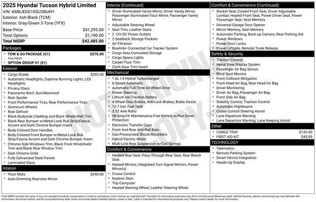 1.6L I4 DGI Hybrid Turbocharged DOHC 16V LEV3-SULEV30, 19" Alloy Wheels, 4-Wheel Disc Brakes, 8 Speakers, ABS brakes, Air Conditioning, Alloy wheels, AM/FM radio: SiriusXM, Apple CarPlay & Android Auto, Auto High-beam Headlights, Auto-dimming Rear-View mirror, Automatic temperature control, Ball Mount Kit, Brake assist, Bumpers: body-color, Cargo Cover, Cargo Tray, Carpeted Floor Mats, Delay-off headlights, Driver door bin, Driver vanity mirror, Dual front impact airbags, Dual front side impact airbags, Electronic Stability Control, Emergency communication system: Bluelink+, First Aid Kit, Four wheel independent suspension, Front anti-roll bar, Front Bucket Seats, Front Center Armrest, Front dual zone A/C, Front reading lights, Fully automatic headlights, Garage door transmitter: HomeLink, Heads-Up Display, Heated & Ventilated Front Bucket Seats, Heated door mirrors, Heated front seats, Heated rear seats, Heated steering wheel, Illuminated entry, Leather steering wheel, Leather-Trimmed Seat Trim, Low tire pressure warning, Memory seat, Navigation System, Occupant sensing airbag, Option Group 01, Outside temperature display, Overhead airbag, Overhead console, Panic alarm, Passenger door bin, Passenger vanity mirror, Power door mirrors, Power driver seat, Power Liftgate, Power moonroof, Power passenger seat, Power steering, Power windows, Radio data system, Radio: Bose Premium w/AM/FM/HD Audio System, Rain sensing wipers, Rear anti-roll bar, Rear reading lights, Rear seat center armrest, Rear side impact airbag, Rear window defroster, Rear window wiper, Remote keyless entry, Security system, Speed control, Split folding rear seat, Spoiler, Steering wheel mounted audio controls, Tachometer, Telescoping steering wheel, Tilt steering wheel, Tow & Go Package, Tow Hitch, Traction control, Trip computer, Turn signal indicator mirrors, Variably intermittent wipers, Ventilated front seats, 1.6L I4 DGI Hybrid Turbocharged DOHC 16V LEV3-SULEV30.