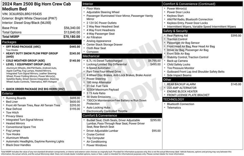 2 Way Rear Headrest Seat, 220 Amp Alternator, 2nd Row In Floor Storage Bins, 3.73 Axle Ratio, 4 Way Front Headrests, 4-Wheel Disc Brakes, 40/20/40 Split Bench Seat, 4G LTE Wi-Fi Hot Spot, 6 Speakers, 8.4" Touchscreen Display, ABS brakes, Active Noise Control System, Air Conditioning, Anti-Spin Differential Rear Axle, Apple CarPlay, Auto Power-Folding Mirrors, Big Horn IP Badge, Black Exterior Mirrors, Bluetooth Handsfree Phone & Audio, Brake assist, Bumpers: chrome, Center Hub, Center Stack Storage Drawer, Chrome Flat Cab-Length Side Steps, Cloth 40/20/40 Bench Seat, Cold Weather Group, Compass, Connectivity - US/Canada, Delay-off headlights, Driver door bin, Dual front impact airbags, Dual front side impact airbags, Dual Glove Boxes, Electronic Stability Control, Electronically Controlled Throttle, Emergency communication system: SiriusXM Guardian, Engine Block Heater, Exterior Mirrors Courtesy Lamps, Exterior Mirrors w/Heating Element, Exterior Mirrors w/Supplemental Signals, Foam Bottle Insert (Door Trim Panel), Footwell Courtesy Lamp, For Details, Visit DriveUconnect.com, For More Info, Call 800-643-2112, Forward & Reverse Utility Lights, Front anti-roll bar, Front Armrest w/Cupholders, Front Center Armrest w/Storage, Front Center Seat Cushion Storage, Front Fog Lamps, Front License Plate Bracket, Front Performance Tuned Shock Absorbers, Front reading lights, Front Seat Back Map Pockets, Fully automatic headlights, Global Telematics Box Module (TBM), Glove Box Lamp, Google Android Auto, GPS Antenna Input, Heated door mirrors, Heavy Duty Snow Plow Prep Group, Hill Descent Control, Illuminated entry, Integrated Center Stack Radio, Integrated Voice Command w/Bluetooth, Leather Wrapped Steering Wheel, Level 1 Equipment Group, Locking Lower Glove Box, Low tire pressure warning, Manual Adjust 4-Way Driver Seat, Manual Adjust 4-Way Front Passenger Seat, Mirror Running Lights, MOPAR Spray In Bedliner, MOPAR Winter Front Grille Cover, Occupant sensing airbag, Off Road Package, Outside temperature display, Overhead airbag, Overhead console, Panic alarm, ParkSense Front/Rear Park Assist System, ParkView Rear Back-Up Camera, Passenger door bin, Passenger vanity mirror, Power 2-Way Driver Lumbar Adjust, Power Adjust 8-Way Driver Seat, Power Adjust Mirrors, Power Adjustable Convex Aux Mirrors, Power door mirrors, Power Heated Fold Telescope Mirrors, Power steering, Power Telescoping Mirrors, Power windows, Premium Cloth 40/20/40 Bench Seat (DISC), Quick Order Package 2HZ Big Horn, Radio data system, Radio: Uconnect 3 w/5" Display, Radio: Uconnect 5 W w/8.4" Display, Rear 60/40 Folding Seat, Rear anti-roll bar, Rear Backup Alarm, Rear Dome w/On/Off Switch Lamp, Rear Folding Seat, Rear Performance Tuned Shock Absorbers, Rear seat center armrest, Rear step bumper, Rear Window Defroster, Remote keyless entry, Remote USB Port - Charge Only, Selectable Tire Fill Alert, SiriusXM Radio Service, SiriusXM Satellite Radio, Speed control, Steering Wheel Mounted Audio Controls, Storage Tray, Tachometer, Tilt steering wheel, Tip Start, Tow Hooks, Traction control, Trip computer, Turn signal indicator mirrors, Variably intermittent wipers, Voltmeter, Wheels: 18" x 8.0" Polished Aluminum, Wheels: 18" x 8.0" Steel Chrome Clad. Bright White Clearcoat 2024 Ram 2500 Big Horn 6-Speed Automatic Cummins 6.7L I6 Turbodiesel 4WD