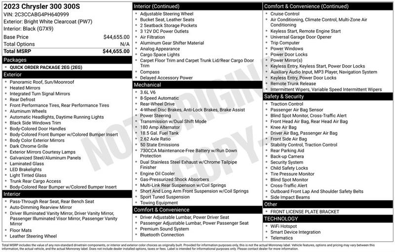 4-Wheel Disc Brakes, 9 Speakers, ABS brakes, Air Conditioning, Alloy wheels, AM/FM radio: SiriusXM, Anti-whiplash front head restraints, Apple CarPlay/Android Auto, Auto-dimming door mirrors, Auto-dimming Rear-View mirror, Automatic temperature control, Blind Spot & Cross Path Detection, Body Color Exterior Mirrors, Brake assist, Bumpers: body-color, Compass, Delay-off headlights, Driver door bin, Driver vanity mirror, Dual front impact airbags, Dual front side impact airbags, Electronic Stability Control, Emergency communication system: SiriusXM Guardian, Exterior Mirrors Courtesy Lamps, Exterior Mirrors w/Heating Element, Exterior Mirrors w/Supplemental Signals, Four wheel independent suspension, Front anti-roll bar, Front Bucket Seats, Front Center Armrest, Front dual zone A/C, Front License Plate Bracket, Front reading lights, Fully automatic headlights, Garage door transmitter, Heated door mirrors, Heated front seats, Illuminated entry, Knee airbag, Leather Trimmed Sport Seats, Low tire pressure warning, Navigation System, Occupant sensing airbag, Outside temperature display, Overhead airbag, Overhead console, Panic alarm, ParkView Rear Back-Up Camera, Passenger door bin, Passenger vanity mirror, Power door mirrors, Power driver seat, Power moonroof, Power passenger seat, Power steering, Power windows, Quick Order Package 2EG, Radio data system, Radio: Uconnect 4C Nav w/8.4" Display, Rear anti-roll bar, Rear Armrest w/Cupholder Seat, Rear reading lights, Rear seat center armrest, Rear window defroster, Remote keyless entry, Security system, Speed control, Speed-sensing steering, Split folding rear seat, Steering wheel mounted audio controls, Surround Sound, Tachometer, Telescoping steering wheel, Tilt steering wheel, Traction control, Trip computer, Turn signal indicator mirrors, Variably intermittent wipers, Wheels: 20" x 8.0" Black Noise Aluminum. Bright White Clearcoat 2023 Chrysler 300 S 8-Speed Automatic 3.6L V6 24V VVT RWD