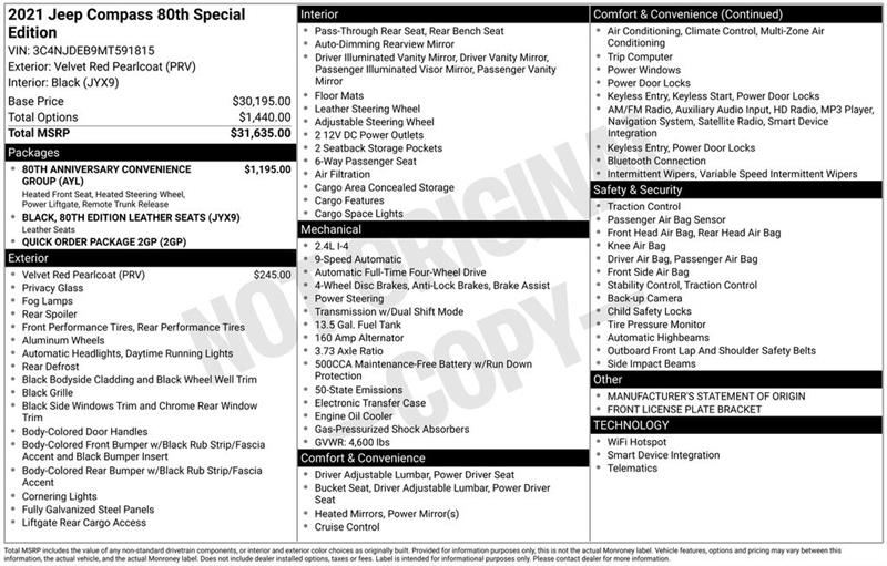 4WD, 3.73 Axle Ratio, 4-Wheel Disc Brakes, 6 Speakers, 80th Anniversary Convenience Group, 80th Edition Leather Seats, ABS brakes, Air Conditioning, Alloy wheels, AM/FM radio: SiriusXM, Anti-whiplash front head restraints, Apple CarPlay/Android Auto, Auto High-beam Headlights, Auto-dimming Rear-View mirror, Automatic temperature control, Brake assist, Bumpers: body-color, Compass, Delay-off headlights, Driver door bin, Driver vanity mirror, Dual front impact airbags, Dual front side impact airbags, Electronic Stability Control, Emergency communication system: SiriusXM Guardian, Four wheel independent suspension, Front anti-roll bar, Front Bucket Seats, Front Center Armrest w/Storage, Front dual zone A/C, Front fog lights, Front License Plate Bracket, Front reading lights, Fully automatic headlights, Heated door mirrors, Heated Front Seats, Heated Steering Wheel, Illuminated entry, Jeep 80th Anniversary Edition, Knee airbag, Low tire pressure warning, Manufacturer's Statement of Origin, Navigation System, Occupant sensing airbag, Outside temperature display, Overhead airbag, Overhead console, Panic alarm, ParkView Rear Back-Up Camera, Passenger door bin, Passenger vanity mirror, Power door mirrors, Power driver seat, Power Liftgate, Power steering, Power windows, Quick Order Package 2GP, Radio: Uconnect 4C Nav w/8.4" Display, Rear anti-roll bar, Rear seat center armrest, Rear window defroster, Rear window wiper, Remote keyless entry, Reversible Carpet/Vinyl Cargo Mat, Roof rack: rails only, Speed control, Split folding rear seat, Spoiler, Steering wheel mounted audio controls, Tachometer, Telescoping steering wheel, Tilt steering wheel, Traction control, Trip computer, Variably intermittent wipers, Wheels: 19" x 7.5" Satin Granite Aluminum, Windshield Wiper De-Icer, 4WD. Velvet Red Pearlcoat 2021 Jeep Compass 80th Special Edition 9-Speed 948TE Automatic 2.4L I4 4WD