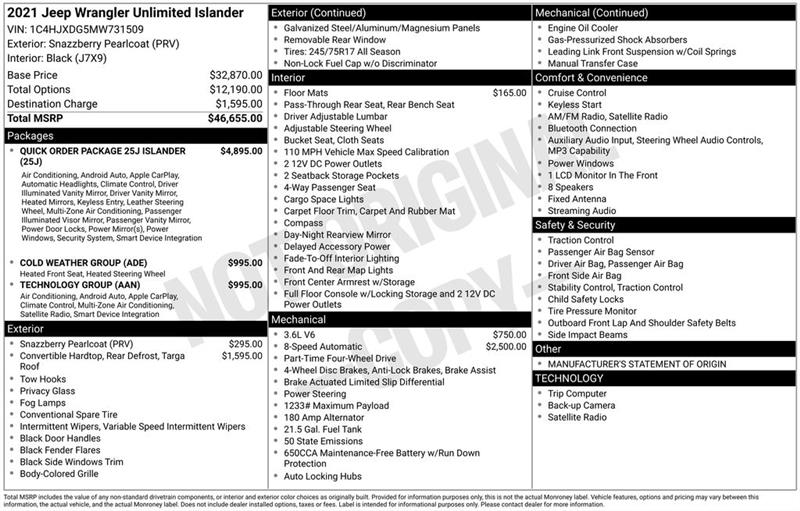3.45 Rear Axle Ratio, 4-Wheel Disc Brakes, 7.0" Touchscreen Display, 8 Speakers, ABS brakes, Air Conditioning, Air Conditioning w/Auto Temperature Control, Air Filtering, AM/FM radio, Apple CarPlay, Automatic Headlamps, Aux Battery, Black 3-Piece Hard Top, Brake assist, Ceramic White I/P Bezels, Cloth Low-Back Bucket Seats, Cloth Seats w/Islander Logo (DISC), Cluster 7.0" TFT Color Display, Cold Weather Group, Compass, Deep Tint Sunscreen Windows, Delay-off headlights, Driver door bin, Driver vanity mirror, Dual front impact airbags, Dual front side impact airbags, Electronic Stability Control, For More Info, Call 800-643-2112, Freedom Panel Storage Bag, Front 1-Touch Down Power Windows, Front anti-roll bar, Front Bucket Seats, Front Center Armrest w/Storage, Front fog lights, Front reading lights, Google Android Auto, GPS Antenna Input, Heated Front Seats, Heated Steering Wheel, Integrated Center Stack Radio, Integrated roll-over protection, Islander Hood Decal, Islander Package, Islander Swing Gate Plaque, Leather Wrapped Steering Wheel, Low tire pressure warning, Manufacturer's Statement of Origin, MOPAR All-Weather Floor Mats (DISC), No Soft Top, Non-Lock Fuel Cap w/o Discriminator, Normal Duty Suspension, Occupant sensing airbag, Outside temperature display, ParkView Rear Back-Up Camera, Passenger door bin, Passenger vanity mirror, Power Heated Mirrors, Power steering, Quick Order Package 25J Islander (DISC), Radio data system, Radio: Uconnect 3 w/5" Display, Radio: Uconnect 4 w/7" Display, Rear anti-roll bar, Rear reading lights, Rear Window Defroster, Rear Window Wiper/Washer, Remote Keyless Entry, Security Alarm, Selectable Tire Fill Alert, Silver Jeep Badges, SiriusXM Radio Service, SiriusXM Satellite Radio, Speed control, Speed Sensitive Power Locks, Split folding rear seat, Steering wheel mounted audio controls, Stop-Start Dual Battery System, Sun Visors w/Illuminated Vanity Mirrors, Tachometer, Technology Group, Telescoping steering wheel, Tilt steering wheel, Traction control, Trip computer, USB Host Flip, Variably intermittent wipers, Wheels: 17" x 7.5" Black Steel Styled, Wheels: 17" x 7.5" Silver Alloy (DISC), Wrangler Decal. Snazzberry Pearlcoat 2021 Jeep Wrangler Unlimited Islander 8-Speed Automatic 3.6L V6 24V VVT 4WD