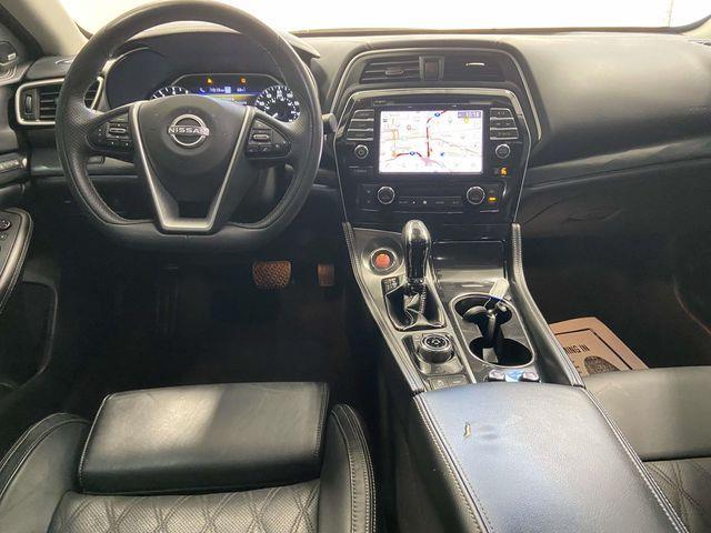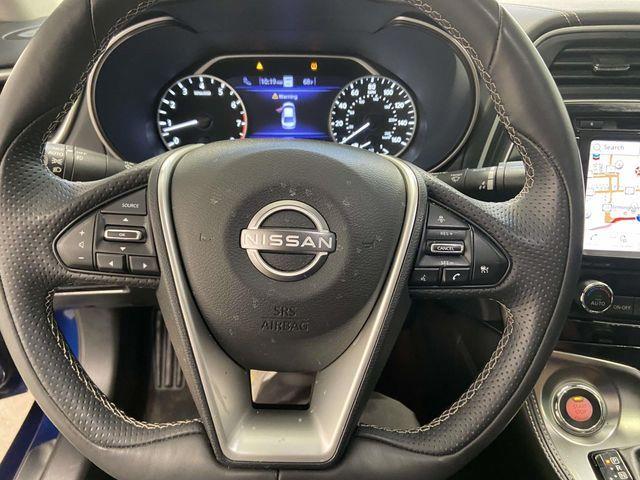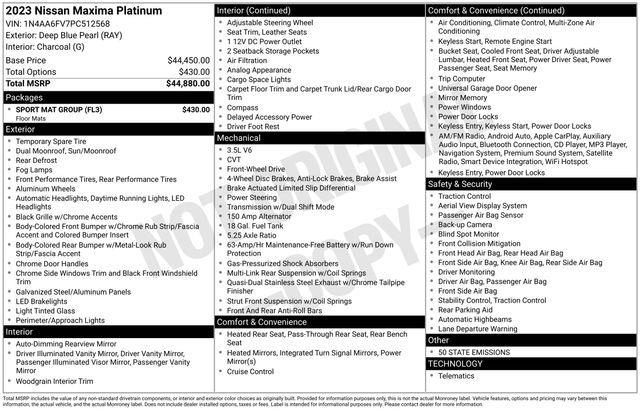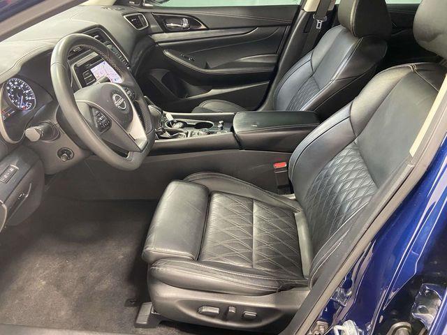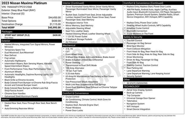 Nissan Certified Certified, 11 Speakers, 19" Aluminum-Alloy Wheels, 4-Wheel Disc Brakes, ABS brakes, Air Conditioning, Alloy wheels, AM/FM radio: SiriusXM, Auto High-beam Headlights, Auto tilt-away steering wheel, Auto-dimming door mirrors, Auto-dimming Rear-View mirror, Automatic temperature control, Bag Hooks, Blind Spot Warning, Brake assist, Bumpers: body-color, CD player, Compass, Delay-off headlights, Driver door bin, Driver vanity mirror, Dual front impact airbags, Dual front side impact airbags, Electronic Stability Control, Emergency communication system: NissanConnect Services, Exterior Parking Camera Rear, First Aid Kit, Four wheel independent suspension, Front anti-roll bar, Front Bucket Seats, Front Center Armrest, Front dual zone A/C, Front fog lights, Front reading lights, Front Zero Gravity Climate-Controlled Seats, Fully automatic headlights, Garage door transmitter: HomeLink, Heated door mirrors, Heated front seats, Heated rear seats, Heated steering wheel, Illuminated entry, Knee airbag, Low tire pressure warning, Memory seat, Navigation system: Nissan Door to Door Connected Navigation, NissanConnect featuring Apple CarPlay and Android Auto, Occupant sensing airbag, Outside temperature display, Overhead airbag, Overhead console, Panic alarm, Passenger door bin, Passenger vanity mirror, Power door mirrors, Power driver seat, Power moonroof, Power passenger seat, Power steering, Power windows, Radio data system, Radio: AM/FM/CD Bose Audio System, Rain sensing wipers, Rear anti-roll bar, Rear reading lights, Rear seat center armrest, Rear side impact airbag, Rear Window Blind, Rear window defroster, Remote keyless entry, Security system, Semi-Aniline Leather-Appointed Seat Trim, Speed control, Speed-sensing steering, Speed-Sensitive Wipers, Split folding rear seat, Sport Floor Mats, Sport steering wheel, Steering wheel memory, Steering wheel mounted audio controls, Tachometer, Telescoping steering wheel, Tilt steering wheel, Traction control, Trip computer, Trunk Mat, Trunk Net, Turn signal indicator mirrors, Variably intermittent wipers, Ventilated front seats. Deep Blue Pearl 2023 Nissan Maxima Platinum FWD CVT with Xtronic 3.5L V6 DOHC 24V