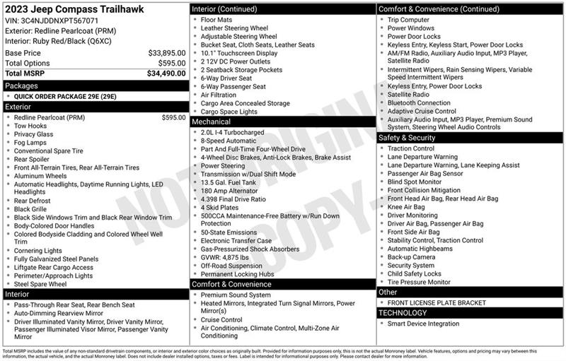 4WD, 10.1" Touchscreen Display, 4-Wheel Disc Brakes, 4.398 Final Drive Ratio, 6 Speakers, ABS brakes, Air Conditioning, Alloy wheels, AM/FM radio: SiriusXM, Auto High-beam Headlights, Auto-dimming Rear-View mirror, Automatic temperature control, Brake assist, Bumpers: body-color, Compass, Delay-off headlights, Disassociated Touchscreen Display, Driver door bin, Driver vanity mirror, Dual front impact airbags, Dual front side impact airbags, Electronic Stability Control, Four wheel independent suspension, Front anti-roll bar, Front Bucket Seats, Front Center Armrest w/Storage, Front dual zone A/C, Front fog lights, Front License Plate Bracket, Front reading lights, Fully automatic headlights, Heated door mirrors, Illuminated entry, Knee airbag, Leather Shift Knob, Low tire pressure warning, Occupant sensing airbag, Outside temperature display, Overhead airbag, Overhead console, Panic alarm, ParkView Rear Back-Up Camera, Passenger door bin, Passenger vanity mirror, Power door mirrors, Power steering, Power windows, Premium Cloth/Leather Trim Bucket Seats, Quick Order Package 29E, Radio: Uconnect 5 w/10.1" Display, Rain sensing wipers, Rear anti-roll bar, Rear seat center armrest, Rear window defroster, Rear window wiper, Remote keyless entry, Security system, SiriusXM Radio Service, Speed control, Split folding rear seat, Spoiler, Steering wheel mounted audio controls, Tachometer, Telescoping steering wheel, Tilt steering wheel, Traction control, Trip computer, Turn signal indicator mirrors, Variably intermittent wipers, Wheels: 17" x 6.5" Painted Black Aluminum, 4WD. Redline Pearlcoat 2023 Jeep Compass Trailhawk 8-Speed Automatic 2.0L I4 DOHC 4WD