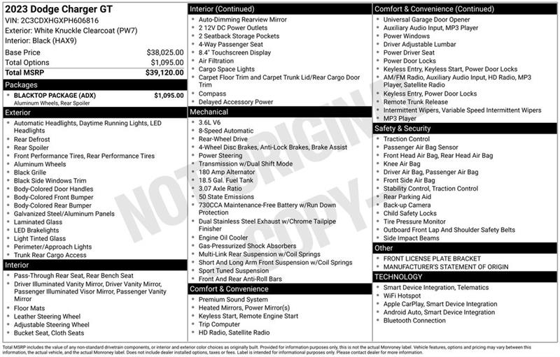 Black Cloth, 1-Yr SiriusXM Guardian Trial, 2-Piece Shark Fin Antenna, 4-Wheel Disc Brakes, 4G LTE Wi-Fi Hot Spot, 6 Speakers, 8.4" Touchscreen Display, ABS brakes, Air Conditioning, Alloy wheels, AM/FM radio: SiriusXM, Anti-whiplash front head restraints, Apple CarPlay, Apple CarPlay/Android Auto, Auto-dimming Rear-View mirror, Automatic temperature control, Black 1-Piece Performance Spoiler, Black Badge, Black Dodge Grille Badge, Blacktop Package, Brake assist, Bumpers: body-color, Cloth Performance Seats, Compass, Delay-off headlights, Driver door bin, Driver vanity mirror, Dual front impact airbags, Dual front side impact airbags, Electronic Stability Control, Emergency communication system: SiriusXM Guardian, For Details, Visit DriveUconnect.com, Four wheel independent suspension, Front anti-roll bar, Front Bucket Seats, Front Center Armrest, Front dual zone A/C, Front License Plate Bracket, Front reading lights, Fully automatic headlights, Garage door transmitter: HomeLink, Gloss Black I/P Cluster Trim Rings, Google Android Auto, GPS Antenna Input, HD Radio, Heated door mirrors, Illuminated entry, Integrated Center Stack Radio, Integrated Voice Command w/Bluetooth, Knee airbag, Leather Shift Knob, Low tire pressure warning, Manufacturer's Statement of Origin, Media Hub (2 USB, AUX), Occupant sensing airbag, Outside temperature display, Overhead airbag, Overhead console, Panic alarm, ParkView Rear Back-Up Camera, Passenger door bin, Passenger vanity mirror, Power 2-Way Driver Lumbar Adjust, Power 8-Way Driver Seat, Power door mirrors, Power driver seat, Power steering, Power windows, Radio: Uconnect 4C w/8.4" Display, Rear anti-roll bar, Rear Armrest w/Cupholder Seat, Rear reading lights, Rear seat center armrest, Rear window defroster, Remote keyless entry, Rhombi 2-Pc Wheel Center Cap, Satin Black Charger Decklid Badge, Satin Black Dodge Tail Lamp Badge, Speed control, Speed-Sensitive Wipers, Split folding rear seat, Spoiler, Steering wheel mounted audio controls, Tachometer, Telescoping steering wheel, Tilt steering wheel, Traction control, Trip computer, USB Host Flip, Variably intermittent wipers, Wheels: 20" x 8" Black Noise Painted, Wheels: 20" x 8" Satin Carbon Painted, Black Cloth. White Knuckle Clearcoat 2023 Dodge Charger GT 8-Speed Automatic 3.6L V6 24V VVT RWD