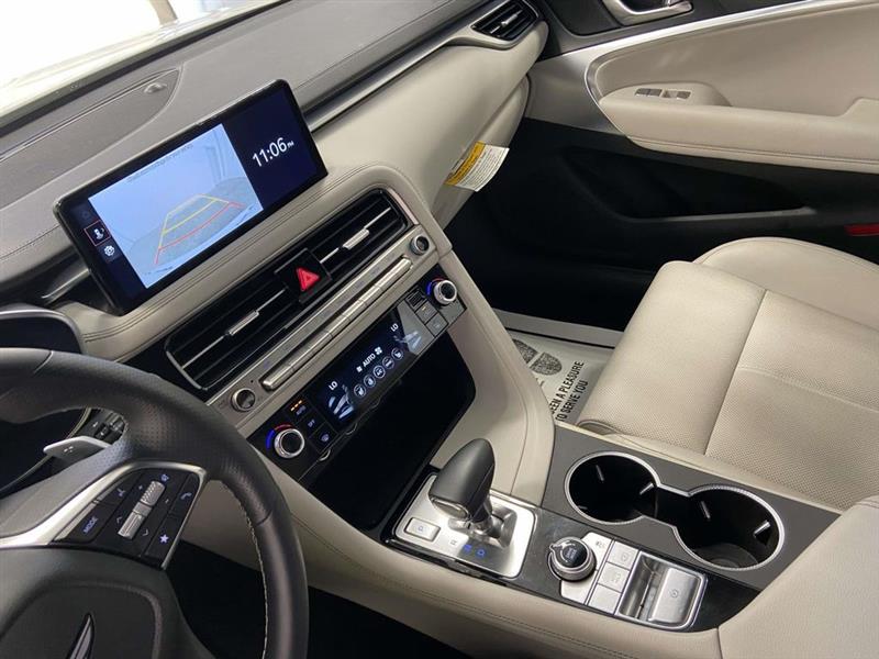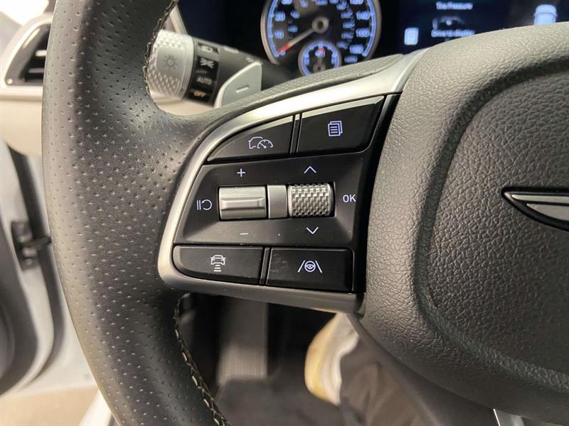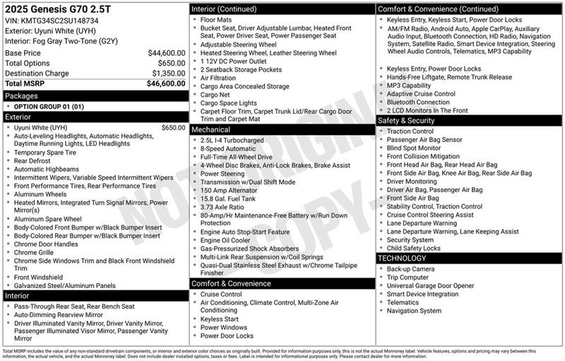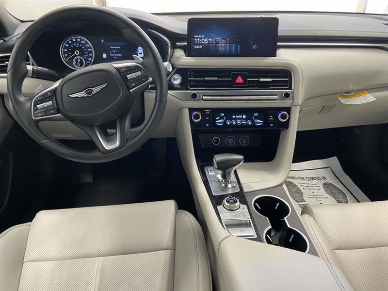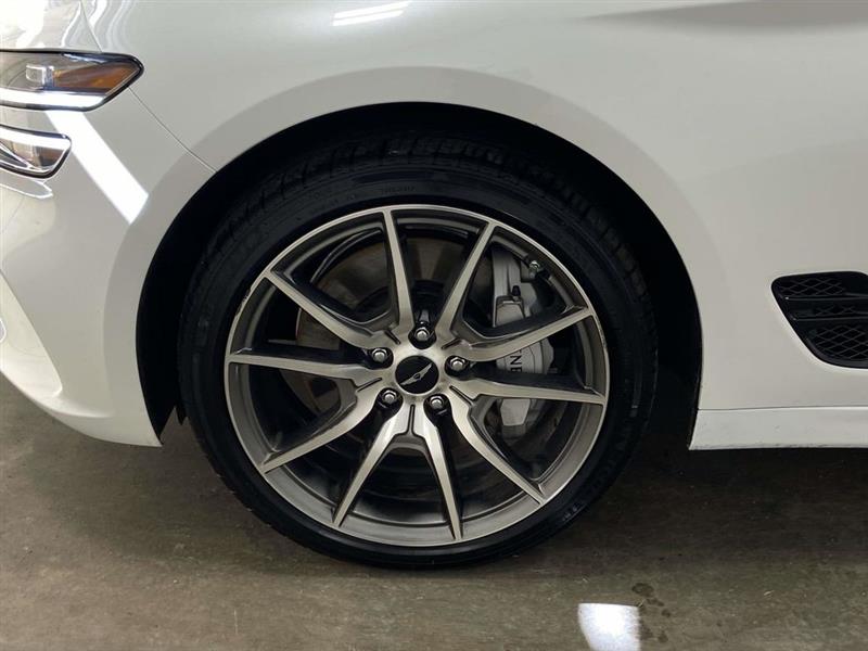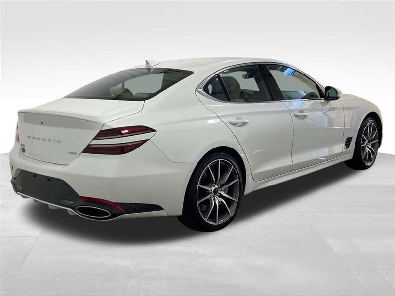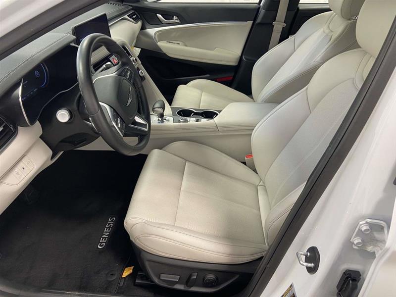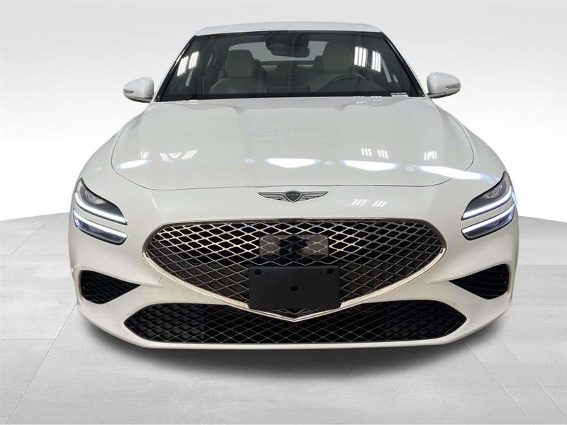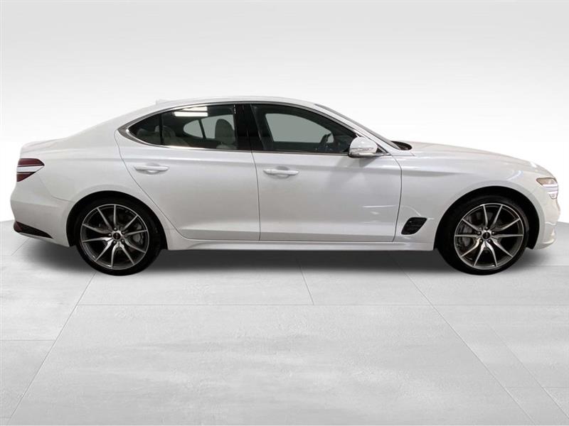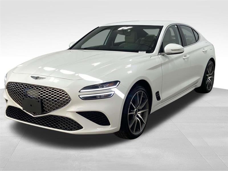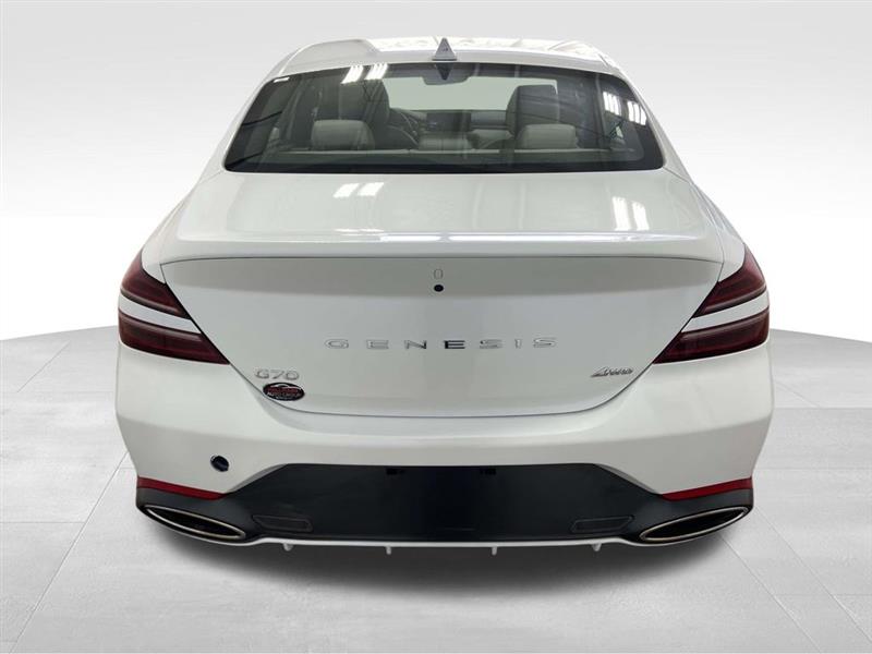 4-Wheel Disc Brakes, 6 Speakers, ABS brakes, Air Conditioning, Alloy wheels, AM/FM radio: SiriusXM, Android Auto & Apple CarPlay, Anti-whiplash front head restraints, Auto High-beam Headlights, Auto-dimming Rear-View mirror, Automatic temperature control, Brake assist, Bumpers: body-color, Delay-off headlights, Driver door bin, Driver vanity mirror, Dual front impact airbags, Dual front side impact airbags, Electronic Stability Control, Emergency communication system: Genesis Connected Services, Exterior Parking Camera Rear, Four wheel independent suspension, Front anti-roll bar, Front Bucket Seats, Front Center Armrest, Front dual zone A/C, Front reading lights, Fully automatic headlights, Garage door transmitter: HomeLink, Heated door mirrors, Heated front seats, Heated Multi-Adjustable Front Bucket Seats, Heated steering wheel, Illuminated entry, Knee airbag, Leather steering wheel, Leatherette Seating Surfaces, Low tire pressure warning, Navigation System, Occupant sensing airbag, Option Group 01, Outside temperature display, Overhead airbag, Overhead console, Panic alarm, Passenger door bin, Passenger vanity mirror, Power door mirrors, Power driver seat, Power passenger seat, Power steering, Power windows, Radio: AM/FM/SiriusXM/HD Audio System, Rear anti-roll bar, Rear reading lights, Rear seat center armrest, Rear side impact airbag, Rear window defroster, Remote keyless entry, Security system, Speed control, Speed-Sensitive Wipers, Split folding rear seat, Steering wheel mounted audio controls, Tachometer, Telescoping steering wheel, Traction control, Trip computer, Turn signal indicator mirrors, Variably intermittent wipers, Wheels: 19" x 8.0J Fr & 19" x 8.5J Rr Alloy. Uyuni White 2025 Genesis G70 2.5T 8-Speed Automatic I4 AWD