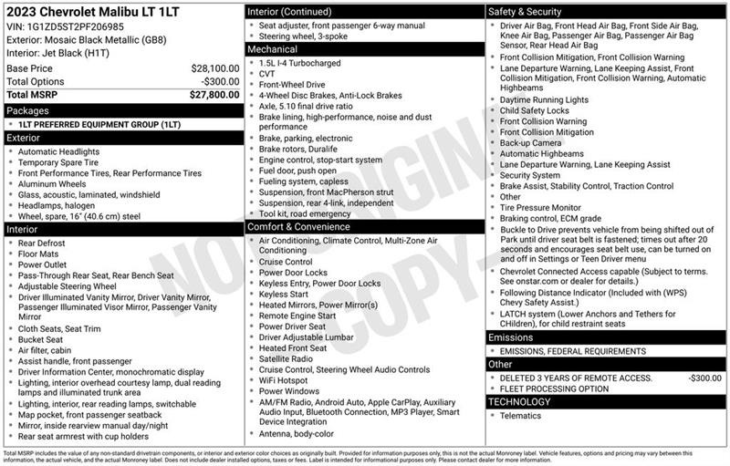 Black Cloth, 17" Aluminum Wheels, 4-Wheel Disc Brakes, 6 Speakers, 6-Speaker Audio System Feature, 6-Way Manual Front Passenger Seat Adjuster, 8-Way Power Driver Seat Adjuster, ABS brakes, Air Conditioning, Alloy wheels, AM/FM radio: SiriusXM, Apple CarPlay/Android Auto, Auto High-beam Headlights, Automatic temperature control, Brake assist, Bumpers: body-color, Compass, Delay-off headlights, Deleted 3 Years of Remote Access, Driver door bin, Driver vanity mirror, Dual front impact airbags, Dual front side impact airbags, Electronic Stability Control, Emergency communication system: OnStar and Chevrolet connected services capable, Exterior Parking Camera Rear, Four wheel independent suspension, Front anti-roll bar, Front Bucket Seats, Front Center Armrest, Front dual zone A/C, Front reading lights, Fully automatic headlights, Heated door mirrors, Heated Driver & Front Passenger Seats, Heated front seats, Illuminated entry, Knee airbag, Low tire pressure warning, Occupant sensing airbag, Outside temperature display, Overhead airbag, Overhead console, Panic alarm, Passenger door bin, Passenger vanity mirror, Power door mirrors, Power Driver Lumbar Control Seat Adjuster, Power driver seat, Power steering, Power windows, Preferred Equipment Group 1LT, Premium audio system: Chevrolet Infotainment 3 Plus, Premium Cloth Seat Trim, Radio data system, Radio: Chevrolet Infotainment 3 System, Rear anti-roll bar, Rear reading lights, Rear seat center armrest, Rear side impact airbag, Rear window defroster, Remote keyless entry, Security system, SiriusXM Radio, Speed control, Split folding rear seat, Steering wheel mounted audio controls, Tachometer, Telescoping steering wheel, Tilt steering wheel, Traction control, Trip computer, Variably intermittent wipers, Voltmeter, Wireless Apple CarPlay/Android Auto, Black Cloth. Mosaic Black Metallic 2023 Chevrolet Malibu LT 1LT CVT 1.5L DOHC FWD