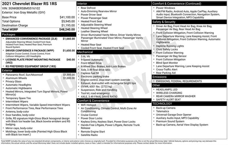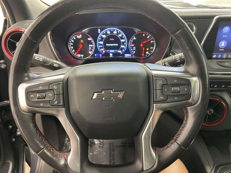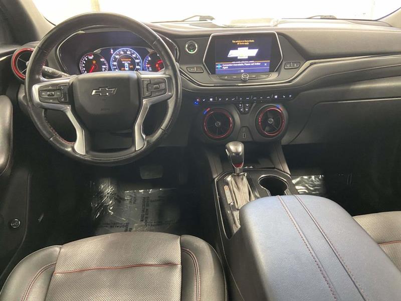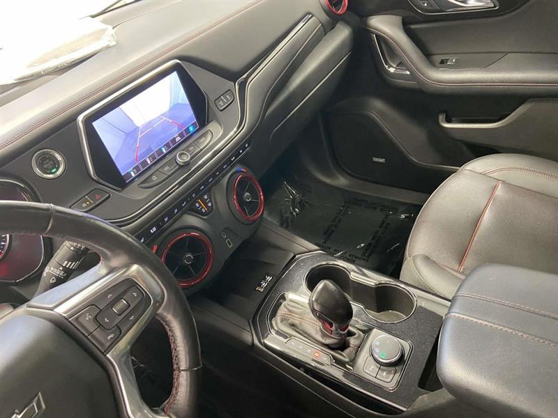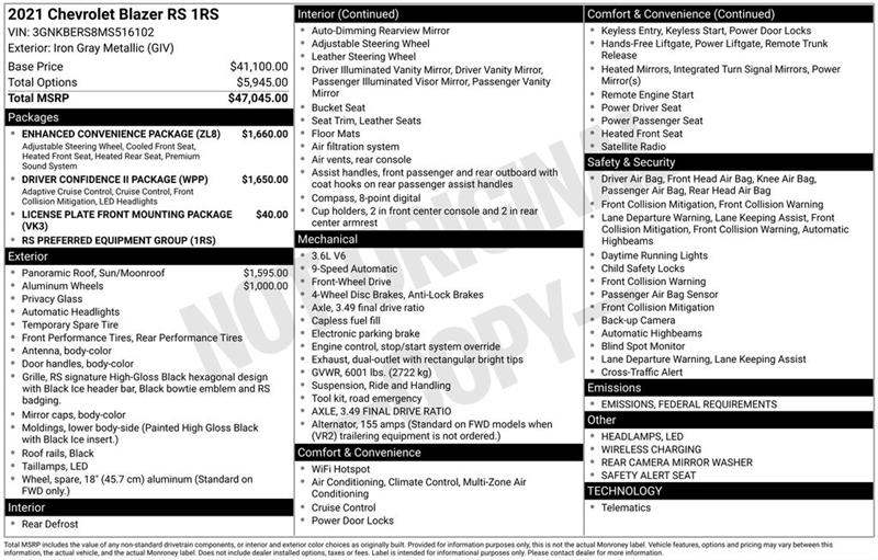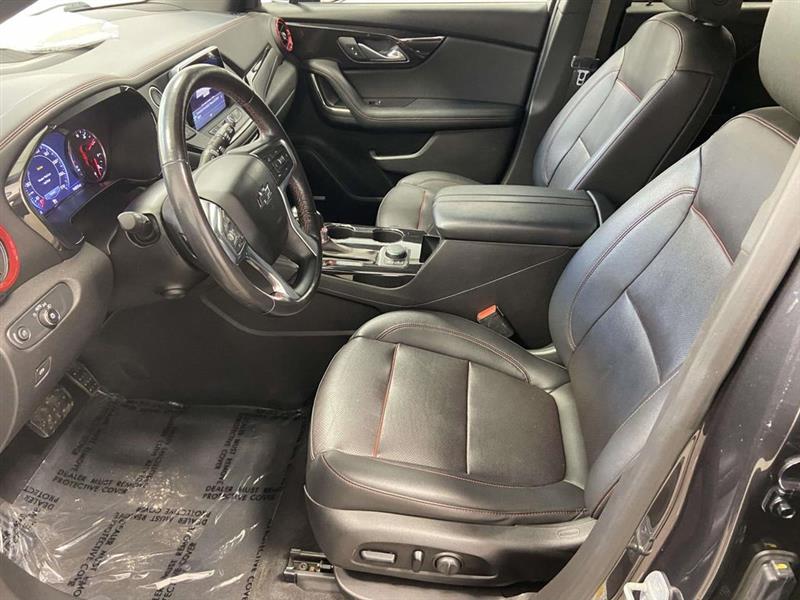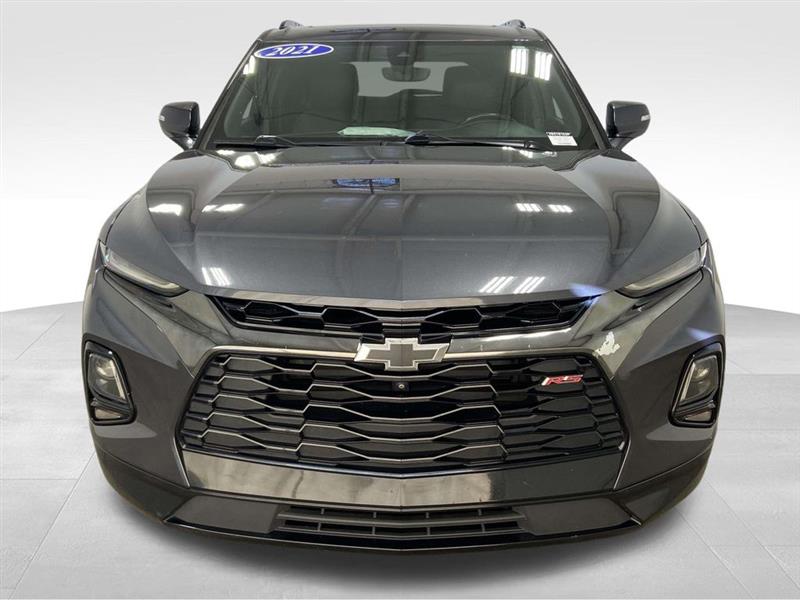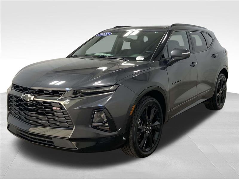 3.49 Final Drive Axle Ratio, 4-Wheel Disc Brakes, 6 Speakers, 6-Speaker Audio System Feature, 6-Way Power Front Passenger Seat Adjuster, ABS brakes, Adaptive Cruise Control, Air Conditioning, Alloy wheels, AM/FM radio: SiriusXM, Apple CarPlay/Android Auto, Auto High-beam Headlights, Auto-dimming door mirrors, Auto-dimming Rear-View mirror, Automatic temperature control, Brake assist, Bumpers: body-color, Child-Seat-Sensing Airbag, Compass, Delay-off headlights, Driver Confidence II Package, Driver door bin, Driver vanity mirror, Dual front impact airbags, Dual front side impact airbags, Electronic Stability Control, Emergency communication system: OnStar and Chevrolet connected services capable, Enhanced Automatic Emergency Braking, Enhanced Convenience Package, Exterior Parking Camera Rear, Four wheel independent suspension, Front anti-roll bar, Front Bucket Seats, Front Center Armrest, Front dual zone A/C, Front reading lights, Fully automatic headlights, Garage door transmitter, HD Surround Vision, Heated door mirrors, Heated Driver & Front Passenger Seats, Heated front seats, Heated Rear Outboard Seating Positions, Heated steering wheel, High-Intensity Discharge Headlights, Illuminated entry, Knee airbag, Leather Shift Knob, LED Headlamps, Low tire pressure warning, Memory Settings For Driver Seat & Exterior Mirrors, Navigation System, Occupant sensing airbag, Outside temperature display, Overhead airbag, Overhead console, Panic alarm, Passenger door bin, Passenger vanity mirror, Perforated Leather-Appointed Seat Trim, Power door mirrors, Power driver seat, Power Liftgate, Power Panoramic Tilt-Sliding Sunroof, Power passenger seat, Power steering, Power Tilt & Telescoping Steering Column, Power windows, Preferred Equipment Group 1RS, Radio data system, Radio: Chevrolet Infotainment 3 Plus System, Rear anti-roll bar, Rear Camera Mirror, Rear Camera Mirror Washer, Rear reading lights, Rear seat center armrest, Rear window defroster, Rear window wiper, Remote keyless entry, Ride & Handling Suspension, Safety Alert Seat, Security system, SiriusXM w/360L, Speed control, Speed-sensing steering, Split folding rear seat, Spoiler, Steering wheel mounted audio controls, Tachometer, Telescoping steering wheel, Tilt steering wheel, Traction control, Trip computer, Turn signal indicator mirrors, Variably intermittent wipers, Ventilated Driver & Front Passenger Seats, Voltmeter, Wheels: 20" Dark Android Machined-Face Aluminum, Wheels: 21" Gloss Black Aluminum, Wireless Charging. Iron Gray Metallic 2021 Chevrolet Blazer RS 9-Speed Automatic 3.6L V6 SIDI DOHC VVT FWD