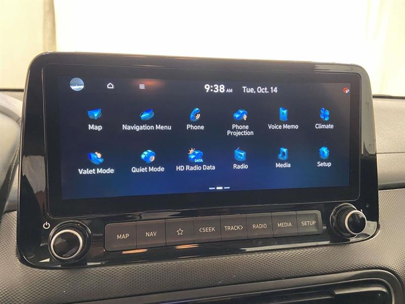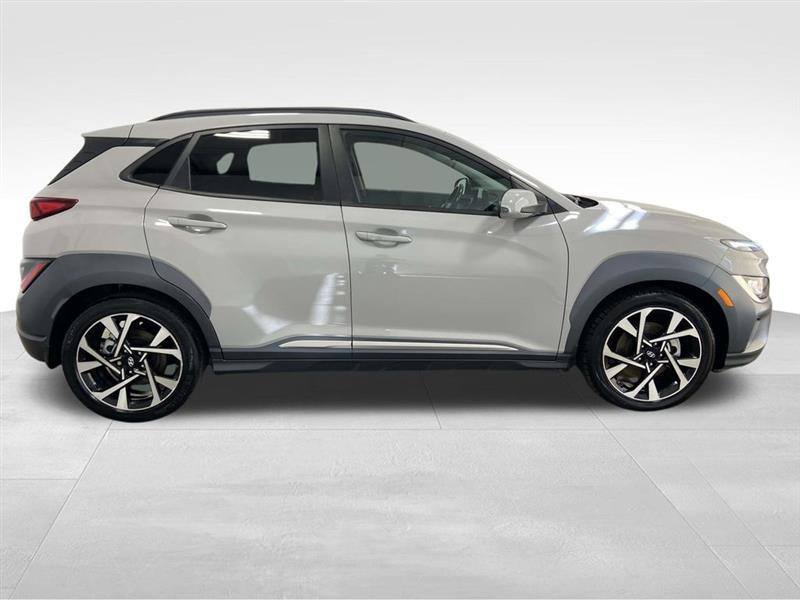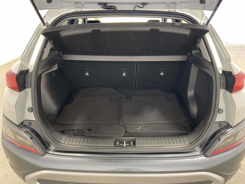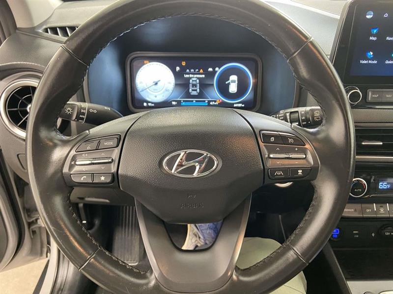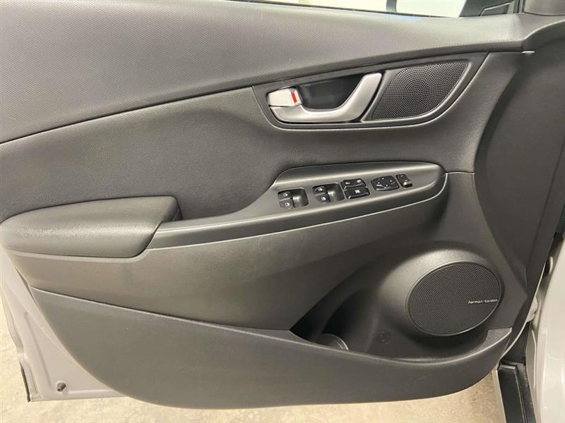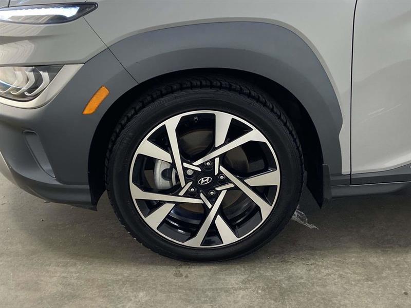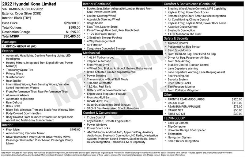 3.174 Axle Ratio, 4-Wheel Disc Brakes, 8 Speakers, ABS brakes, Air Conditioning, Alloy wheels, AM/FM radio: SiriusXM, Apple CarPlay & Android Auto, Auto High-beam Headlights, Auto-dimming Rear-View mirror, Automatic temperature control, Brake assist, Bumpers: body-color, Cargo Net, Cargo Tray, Carpeted Floor Mats, Delay-off headlights, Driver door bin, Driver vanity mirror, Dual front impact airbags, Dual front side impact airbags, Electronic Stability Control, Emergency communication system: Blue Link Connected Car Service (3-year complimentary subscription), Exterior Parking Camera Rear, First Aid Kit, Front & Rear Mudguards, Front anti-roll bar, Front Bucket Seats, Front Center Armrest, Front reading lights, Front wheel independent suspension, Fully automatic headlights, Garage door transmitter: HomeLink, harman/kardon® Speakers, Heated door mirrors, Heated Front Bucket Seats, Heated front seats, Illuminated entry, Leather Seat Trim, Leather Shift Knob, Leather steering wheel, Low tire pressure warning, Navigation System, Occupant sensing airbag, Option Group 01, Overhead airbag, Overhead console, Panic alarm, Passenger door bin, Passenger vanity mirror, Power door mirrors, Power driver seat, Power moonroof, Power steering, Power windows, Radio: Harman Kardon Premium Audio System, Rain sensing wipers, Rear Bumper Applique, Rear seat center armrest, Rear window defroster, Rear window wiper, Remote keyless entry, Security system, Speed control, Speed-sensing steering, Split folding rear seat, Spoiler, Steering wheel mounted audio controls, Tachometer, Telescoping steering wheel, Tilt steering wheel, Traction control, Trip computer, Turn signal indicator mirrors, Variably intermittent wipers, Wheels: 18 x 7.5J Alloy. Cyber Silver 2022 Hyundai Kona Limited 7-Speed Automatic 1.6L I4 DGI Turbocharged DOHC 16V LEV3-ULEV70 195hp FWD