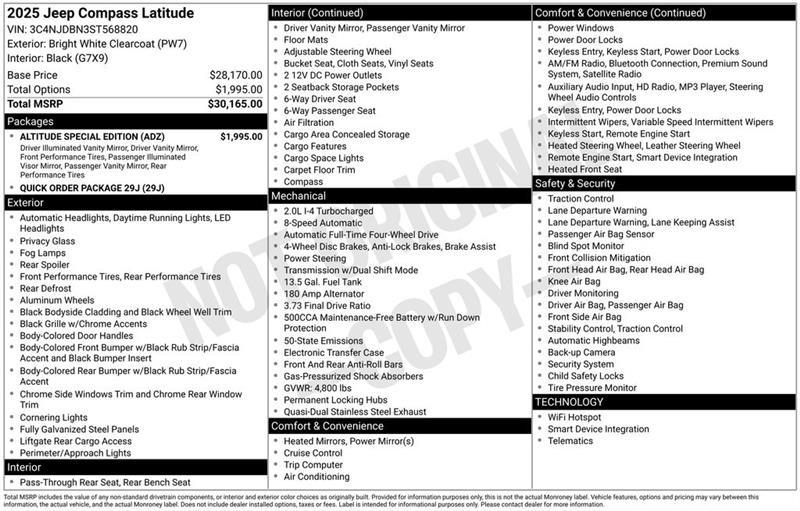 4WD, 10.1" Touchscreen Display, 3.73 Final Drive Ratio, 4-Wheel Disc Brakes, 6 Speakers, ABS brakes, Air Conditioning, Alloy wheels, Altitude Special Edition, AM/FM radio: SiriusXM, Apple CarPlay/Android Auto, Auto High-beam Headlights, Black Day Light Opening Moldings, Brake assist, Bumpers: body-color, Compass, Delay-off headlights, Driver door bin, Driver vanity mirror, Dual front impact airbags, Dual front side impact airbags, Electronic Stability Control, Emergency communication system: Jeep Connect, Four wheel independent suspension, Front anti-roll bar, Front Bucket Seats, Front Center Armrest w/Storage, Front fog lights, Front reading lights, Fully automatic headlights, Gloss Black Surround/Neutral Gray Rings, Heated door mirrors, Heated front seats, Heated steering wheel, Illuminated entry, Knee airbag, Leather Shift Knob, Leather steering wheel, Low tire pressure warning, Neutral Gray Exterior Badging, Occupant sensing airbag, Outside temperature display, Overhead airbag, Overhead console, Panic alarm, ParkView Rear Back-Up Camera, Passenger door bin, Passenger vanity mirror, Piano Black Interior Accents, Power door mirrors, Power steering, Power windows, Premium audio system: UConnect 5, Premium Cloth/Vinyl Bucket Seats, Quick Order Package 29J, Radio: Uconnect 5 w/8.4" Display, Rear anti-roll bar, Rear seat center armrest, Rear window defroster, Rear window wiper, Remote keyless entry, Security system, Sliding Sun Visors w/Illuminated Mirrors, Speed control, Split folding rear seat, Spoiler, Steering wheel mounted audio controls, Tachometer, Telescoping steering wheel, Tilt steering wheel, Traction control, Trip computer, Variably intermittent wipers, Wheels: 17" x 7" Aluminum (DISC), Wheels: 18" x 7" Gloss Black Painted Aluminum, 4WD. Bright White Clearcoat 2025 Jeep Compass Latitude 8-Speed Automatic 2.0L I4 DOHC 4WD