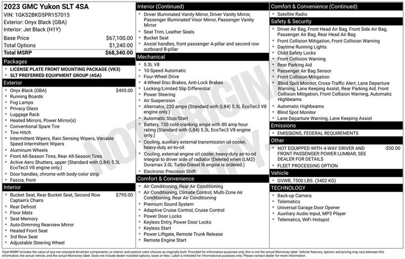 4WD, 2 Presets For Power Driver Seat, 2nd Row Manual-Folding Bucket Seats, 3.23 Rear Axle Ratio, 3rd row seats: split-bench, 4-Wheel Disc Brakes, 9 Speakers, ABS brakes, Air Conditioning, Alloy wheels, AM/FM radio: SiriusXM with 360L, AM/FM Stereo, Apple CarPlay/Android Auto, Auto High-beam Headlights, Auto-dimming Rear-View mirror, Automatic Emergency Braking, Automatic temperature control, Bodyside moldings, Bose 9-Speaker Stereo Audio System Feature, Brake assist, Bright Chrome Bodyside Moldings, Bright Front & Rear Door Sill Plates, Bumpers: body-color, Chrome Door Handles w/Body-Color Strip, Compass, Delay-off headlights, Driver door bin, Driver vanity mirror, Dual front impact airbags, Dual front side impact airbags, Electronic Stability Control, Emergency communication system: OnStar and GMC connected services capable, Following Distance Indicator, Forward Collision Alert, Four wheel independent suspension, Front & Rear Park Assist, Front anti-roll bar, Front Bucket Seats, Front Center Armrest, Front dual zone A/C, Front fog lights, Front Pedestrian Braking, Front reading lights, Fully automatic headlights, Garage door transmitter, Hands-Free Power Programmable Rear Liftgate, Heated & Ventilated Driver & Front Passenger Seats, Heated door mirrors, Heated Driver & Front Passenger Seats, Heated front seats, Illuminated entry, Inside Rear-View Auto-Dimming Mirror, IntelliBeam Automatic High Beam On/Off, Lane Change Alert w/Side Blind Zone Alert, Lane Keep Assist w/Lane Departure Warning, License Plate Front Mounting Package, Low tire pressure warning, Memory seat, Navigation System, Not Equipped w/4-Way Driver & Fr Pass Pwr Lumbar, Occupant sensing airbag, Outside temperature display, Overhead airbag, Overhead console, Panic alarm, Passenger door bin, Passenger vanity mirror, Perforated Leather-Appointed Seating, Power door mirrors, Power driver seat, Power Liftgate, Power passenger seat, Power steering, Power windows, Preferred Equipment Group 4SA, Premium Smooth Ride Suspension, Rain sensing wipers, Rear air conditioning, Rear anti-roll bar, Rear Cross Traffic Alert, Rear reading lights, Rear seat center armrest, Rear window defroster, Rear window wiper, Remote keyless entry, Roof rack: rails only, Safety Alert Seat, Security system, SiriusXM w/360L, Speed control, Speed-sensing steering, Split folding rear seat, Spoiler, Steering wheel mounted audio controls, Tachometer, Telescoping steering wheel, Tilt steering wheel, Traction control, Trip computer, Universal Home Remote, Variably intermittent wipers, Ventilated front seats, Voltmeter, Wheels: 20" x 9" 6-Spoke Polished Aluminum, Wireless Charging, 4WD. Onyx Black 2023 GMC Yukon SLT 10-Speed Automatic with Overdrive EcoTec3 5.3L V8 4WD