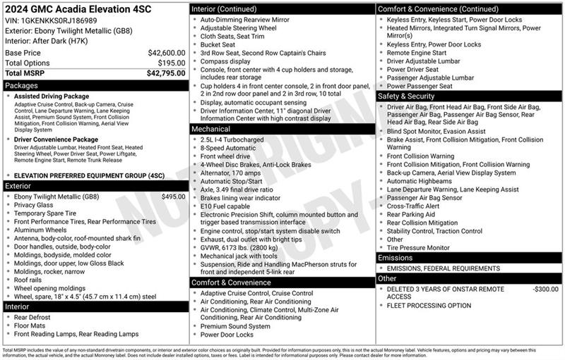 FWD, 12 Speakers, 3.49 Final Drive Axle Ratio, 3rd row seats: split-bench, 4-Wheel Disc Brakes, 6-Way Power Front Passenger Seat Adjuster, 7-Passenger Seating (2-2-3 Seating Configuration), 8-Way Power Driver Seat Adjuster, ABS brakes, Air Conditioning, Alloy wheels, AM/FM radio: SiriusXM with 360L, Apple CarPlay/Android Auto, Auto High-beam Headlights, Auto-dimming Rear-View mirror, Automatic temperature control, Bodyside moldings, Bose Performance 12-Speaker System w/Sub-woofer, Brake assist, Bumpers: body-color, Compass, CoreTec Seat Trim, Delay-off headlights, Driver 4-Way Power Lumbar Seat Adjuster, Driver door bin, Driver vanity mirror, Dual front impact airbags, Dual front side impact airbags, Electronic Stability Control, Emergency communication system: OnStar and GMC connected services capable, Exterior Parking Camera Rear, Four wheel independent suspension, Front anti-roll bar, Front Bucket Seats, Front Center Armrest, Front dual zone A/C, Front fog lights, Front Passenger 4-Way Power Lumbar Seat Adjuster, Front reading lights, Fully automatic headlights, Garage door transmitter, Heated door mirrors, Heated Driver & Front Passenger Seats, Heated front seats, Heated steering wheel, Illuminated entry, Leather steering wheel, Low tire pressure warning, Navigation System, Occupant sensing airbag, Outside temperature display, Overhead airbag, Overhead console, Panic alarm, Passenger door bin, Passenger vanity mirror, Power door mirrors, Power driver seat, Power Liftgate, Power passenger seat, Power steering, Power windows, Radio data system, Radio: 15" Premium GMC Infotainment System, Rear air conditioning, Rear anti-roll bar, Rear reading lights, Rear side impact airbag, Rear window defroster, Rear window wiper, Remote keyless entry, Security system, SiriusXM w/360L, Speed control, Speed-sensing steering, Split folding rear seat, Spoiler, Sport steering wheel, Steering wheel mounted audio controls, Tachometer, Telescoping steering wheel, Tilt steering wheel, Traction control, Trip computer, Turn signal indicator mirrors, Variably intermittent wipers, Voltmeter, Wheels: 20" x 8" Bright Silver Aluminum, FWD. 2024 GMC Acadia Elevation 8-Speed Automatic 2.5L DOHC FWD