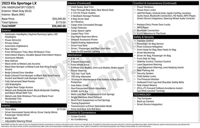 17" Alloy Wheels, 4-Wheel Disc Brakes, 6 Speakers, ABS brakes, Air Conditioning, Alloy wheels, AM/FM radio, Auto High-beam Headlights, Axle Ratio: 3.648, Brake assist, Bumpers: body-color, Cloth Seat Trim, Delay-off headlights, Driver door bin, Driver vanity mirror, Dual front impact airbags, Dual front side impact airbags, Electronic Stability Control, Four wheel independent suspension, Front anti-roll bar, Front Bucket Seats, Front Center Armrest, Fully automatic headlights, Illuminated entry, Low tire pressure warning, Occupant sensing airbag, Outside temperature display, Overhead airbag, Overhead console, Panic alarm, Passenger door bin, Passenger vanity mirror, Power door mirrors, Power steering, Power windows, Radio: AM/FM/HD Audio System, Rear anti-roll bar, Rear seat center armrest, Rear window defroster, Rear window wiper, Remote keyless entry, Security system, Speed control, Speed-sensing steering, Split folding rear seat, Spoiler, Steering wheel mounted audio controls, Tachometer, Telescoping steering wheel, Tilt steering wheel, Traction control, Trip computer, Variably intermittent wipers. 2023 Kia Sportage LX 8-Speed Automatic I4 FWD