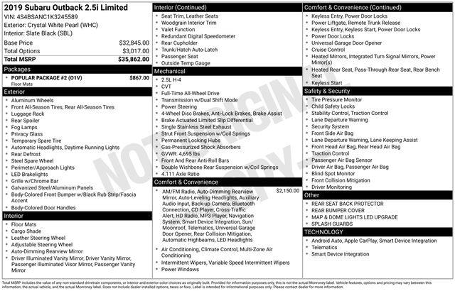 Recent Arrival! 2019 Subaru Outback 2.5i Limited AWD - Crystal White Pearl