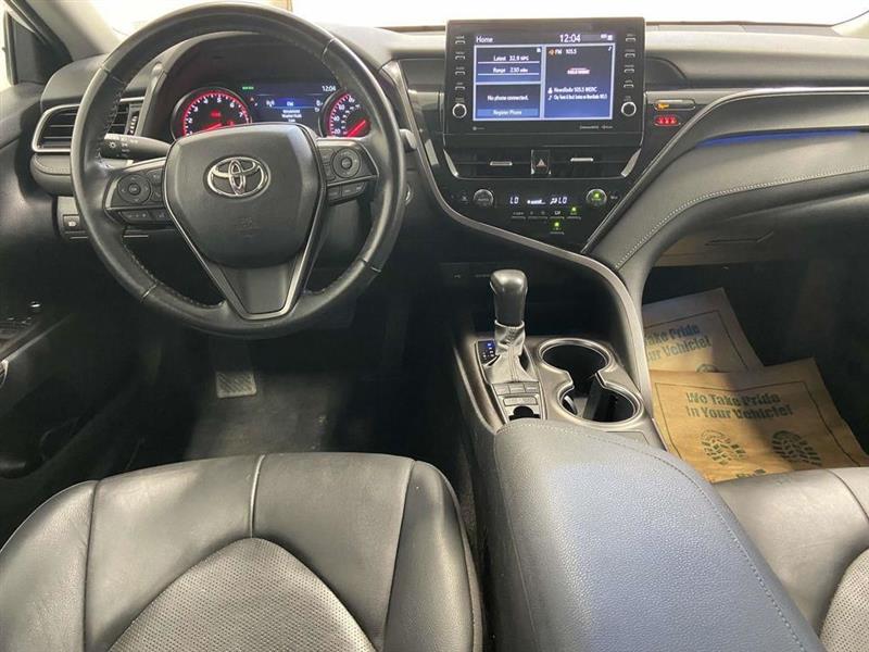 Leather, 4-Wheel Disc Brakes, 6 Speakers, ABS brakes, Air Conditioning, Alloy wheels, AM/FM radio: SiriusXM, Apple CarPlay/Android Auto, Auto High-beam Headlights, Auto-dimming Rear-View mirror, Automatic temperature control, Brake assist, Bumpers: body-color, Delay-off headlights, Driver door bin, Driver vanity mirror, Dual front impact airbags, Dual front side impact airbags, Electronic Stability Control, Emergency communication system: Safety Connect (1-year trial), Exterior Parking Camera Rear, Four wheel independent suspension, Front anti-roll bar, Front Bucket Seats, Front Center Armrest, Front dual zone A/C, Front reading lights, Fully automatic headlights, Garage door transmitter: HomeLink, Heated door mirrors, Heated front seats, Illuminated entry, Knee airbag, Leather steering wheel, Low tire pressure warning, Multi-Stage Heated Front Bucket Seats, Occupant sensing airbag, Outside temperature display, Overhead airbag, Overhead console, Panic alarm, Passenger door bin, Passenger vanity mirror, Perforated Leather Seat Trim, Power door mirrors, Power driver seat, Power passenger seat, Power steering, Power windows, Radio data system, Radio: Audio Plus, Rear anti-roll bar, Rear reading lights, Rear seat center armrest, Rear side impact airbag, Rear window defroster, Remote keyless entry, Security system, Speed control, Speed-sensing steering, Split folding rear seat, Spoiler, Steering wheel mounted audio controls, Tachometer, Telescoping steering wheel, Tilt steering wheel, Traction control, Trip computer, Turn signal indicator mirrors, Variably intermittent wipers, Wheels: 8.0J x 19" Alloy, Leather. 2023 Toyota Camry XSE 8-Speed Automatic 2.5L I4 DOHC 16V FWD