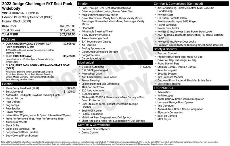 1-Yr SiriusXM Guardian Trial, 4-Wheel Disc Brakes, 4G LTE Wi-Fi Hot Spot, 6 Speakers, 8.4" Touchscreen Display, ABS brakes, Adaptive Damping Suspension, Air Conditioning, Alloy wheels, AM/FM radio: SiriusXM, Anti-whiplash front head restraints, Apple CarPlay, Apple CarPlay/Android Auto, Auto-dimming Rear-View mirror, Automatic temperature control, Black-Edged Premium Floormats, Body Color Exterior Mirrors, Brake assist, Brembo 6-Pot Fixed Front Caliper Brakes, Bumpers: body-color, Compass, Compass Gauge, Delay-off headlights, Driver door bin, Driver vanity mirror, Dual front impact airbags, Dual front side impact airbags, Electronic Stability Control, Emergency communication system: SiriusXM Guardian, Exterior Mirrors w/Heating Element, Flat-Bottom Steering Wheel, For Details, Visit DriveUconnect.com, For More Info, Call 800-643-2112, Four wheel independent suspension, Front anti-roll bar, Front Bucket Seats, Front Center Armrest, Front dual zone A/C, Front fog lights, Front reading lights, Fully automatic headlights, Garage door transmitter, Google Android Auto, GPS Antenna Input, HD Radio, Heated door mirrors, Heated Front Seats, Heated Steering Wheel, High-Intensity Discharge Headlamps, Houndstooth Cloth Performance Seats, Illuminated entry, Integrated Center Stack Radio, Integrated Voice Command w/Bluetooth, Leather Shift Knob, Low tire pressure warning, Media Hub (2 USB, AUX), Outside temperature display, Overhead airbag, Overhead console, Panic alarm, ParkView Rear Back-Up Camera, Passenger door bin, Passenger vanity mirror, Performance Shift Indicator, Plus Package, Power door mirrors, Power driver seat, Power Multi-Function Foldaway Mirrors, Power steering, Power Sunroof, Power Tilt/Telescope Steering Column, Power windows, Premium-Stitched Dash Panel, Quick Order Package 24N R/T Scat Pack Widebody, Radio data system, Radio: Uconnect 4C w/8.4" Display, Radio/Driver Seat/Mirrors Memory, Rear anti-roll bar, Rear reading lights, Rear seat center armrest, Rear window defroster, Remote keyless entry, Rhombi 2-Pc Wheel Center Cap, Scat Pack Logo Nappa/Alcantara Seat, Security system, Shark Fin Antenna, SiriusXM Radio Service, SiriusXM Satellite Radio, Speed control, Speed-sensing steering, Split folding rear seat, Spoiler, Sport steering wheel, Steering wheel mounted audio controls, Tachometer, Telescoping steering wheel, Tilt steering wheel, Traction control, Trip computer, USB Host Flip, Variably intermittent wipers, Ventilated Front Seats, Wheels: 20" x 11.0" Carbon Black Aluminum, Wheels: 20" x 9.0" Lo Gloss Granite Crystal, Widebody Competition Suspension, Widebody Fender Flares. Plum Crazy Pearlcoat 2023 Dodge Challenger R/T Scat Pack Widebody 8-Speed Automatic SRT HEMI 6.4L V8 MDS RWD