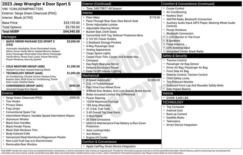2-Door Passive Entry, Front Door Locks, 3.45 Overall Top Gear Ratio, 4-Wheel Disc Brakes, 8 Speakers, ABS brakes, Air Conditioning, Air Conditioning w/Auto Temperature Control, Air Filtering, AM/FM radio, Apple CarPlay, Apple CarPlay/Android Auto, Automatic Headlamps, Aux Battery, Brake assist, Cloth Low-Back Bucket Seats, Cluster 7.0" TFT Color Display, Cold Weather Group, Compass, Convenience Group, Deep Tint Sunscreen Windows, Delay-off headlights, Driver door bin, Driver vanity mirror, Dual front impact airbags, Dual front side impact airbags, Electronic Stability Control, Emergency communication system: SiriusXM Guardian, Engine Oil Cooler, Front 1-Touch Down Power Windows, Front anti-roll bar, Front Bucket Seats, Front Center Armrest w/Storage, Front fog lights, Front reading lights, Google Android Auto, GPS Antenna Input, Heated Front Seats, Heated Steering Wheel, Integrated Center Stack Radio, Integrated roll-over protection, Integrated Voice Command w/Bluetooth, Low tire pressure warning, MOPAR All-Weather Floor Mats, Non-Lock Fuel Cap w/o Discriminator, Normal Duty Suspension, Occupant sensing airbag, Outside temperature display, ParkView Rear Back-Up Camera, Passenger door bin, Passenger vanity mirror, Power Heated Mirrors, Power steering, Premium Wrapped Steering Wheel, Quick Order Package 22S Sport S, Radio data system, Radio: Uconnect 4 w/7" Display, Rear anti-roll bar, Rear reading lights, Remote Keyless Entry, Security Alarm, SiriusXM Satellite Radio, Speed control, Speed Sensitive Power Locks, Split folding rear seat, Sport S, Steering wheel mounted audio controls, Stop-Start Dual Battery System, Sun Visors w/Illuminated Vanity Mirrors, Tachometer, Technology Group, Telescoping steering wheel, Tilt steering wheel, Traction control, Trip computer, Universal Garage Door Opener, USB Host Flip, Variably intermittent wipers, Wheels: 17" x 7.5 Tech Silver Aluminum, Wheels: 17" x 7.5" Black Steel Styled. Sarge Green Clearcoat 2023 Jeep Wrangler Sport S 8-Speed Automatic 2.0L I4 DOHC 4WD