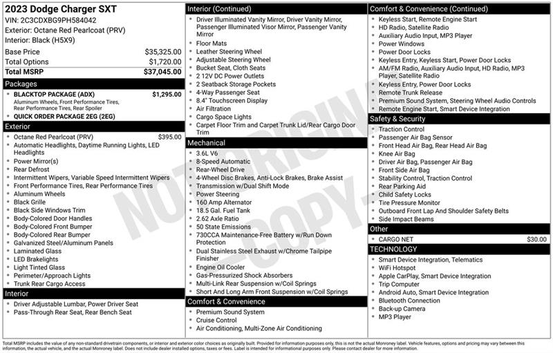 Black Cloth, 1-Yr SiriusXM Guardian Trial, 2-Piece Shark Fin Antenna, 276 Watt Amplifier, 4-Wheel Disc Brakes, 4G LTE Wi-Fi Hot Spot, 6 Speakers, 8.4" Touchscreen Display, ABS brakes, Air Conditioning, Alloy wheels, AM/FM radio: SiriusXM, Anti-whiplash front head restraints, Apple CarPlay, Apple CarPlay/Android Auto, AutoStick Automatic Transmission, Black 1-Piece Performance Spoiler, Blacktop Package (DISC), Brake assist, Bumpers: body-color, Cargo Net, Compass, Delay-off headlights, Dodge Grille Badge, Driver door bin, Driver vanity mirror, Dual front impact airbags, Dual front side impact airbags, Electronic Stability Control, Emergency communication system: SiriusXM Guardian, For Details, Visit DriveUconnect.com, Four wheel independent suspension, Front anti-roll bar, Front Bucket Seats, Front Center Armrest, Front dual zone A/C, Front reading lights, Fully automatic headlights, Gloss Black Fascia Applique, Gloss Black I/P Cluster Trim Rings, Google Android Auto, GPS Antenna Input, HD Radio, Houndstooth Cloth Sport Seat, Illuminated entry, Integrated Center Stack Radio, Integrated Voice Command w/Bluetooth, Knee airbag, Leather Shift Knob, Low tire pressure warning, Media Hub (2 USB, AUX), Occupant sensing airbag, Outside temperature display, Overhead airbag, Overhead console, Panic alarm, ParkView Rear Back-Up Camera, Passenger door bin, Passenger vanity mirror, Power door mirrors, Power driver seat, Power steering, Power windows, Quick Order Package 2EG, Radio: Uconnect 4C w/8.4" Display, Rear anti-roll bar, Rear reading lights, Rear seat center armrest, Rear window defroster, Remote keyless entry, Satin Black Charger Decklid Badge, Satin Black Dodge Tail Lamp Badge, Speed control, Speed-Sensitive Wipers, Split folding rear seat, Sport Suspension, Steering wheel mounted audio controls, Tachometer, Telescoping steering wheel, Tilt steering wheel, Traction control, Trip computer, USB Host Flip, Variably intermittent wipers, Wheels: 17" x 7" Painted Cast Aluminum, Wheels: 20" x 8" Black Noise Painted (DISC), Black Cloth. Octane Red Pearlcoat 2023 Dodge Charger SXT 8-Speed Automatic 3.6L V6 24V VVT RWD