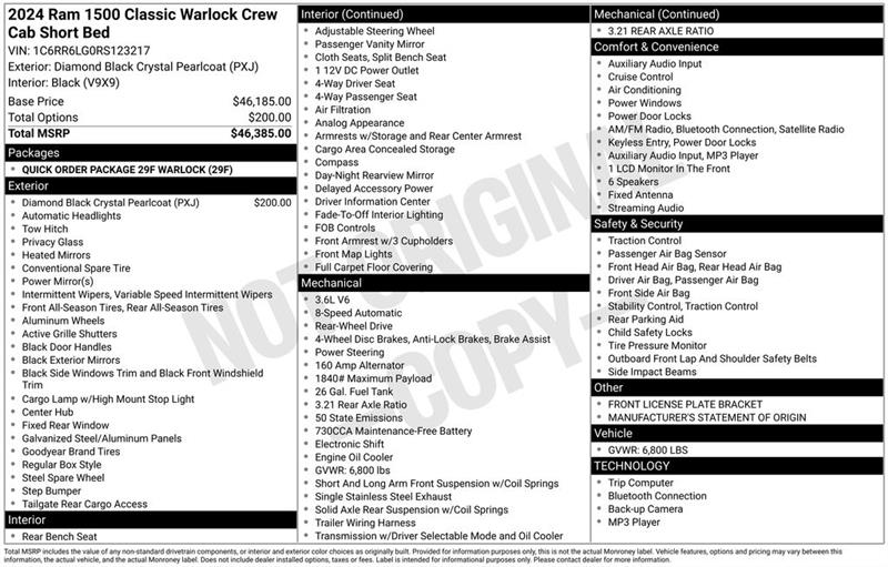 17" x 7" Aluminum Wheels, 3.21 Rear Axle Ratio, 4-Wheel Disc Brakes, 40/20/40 Split Bench Seat, 6 Speakers, ABS brakes, Active Grille Shutters, Air Conditioning, Alloy wheels, AM/FM radio: SiriusXM, Audio Input Jack for Mobile Devices, Black Exterior Mirrors, Black Grille w/RAM Lettering, Black Powder Coated Front Bumper, Black Powder Coated Rear Bumper, Black RAM Head Tailgate Badge, Black Wheel Flares, Brake assist, Bumpers: chrome, Center Hub, Cloth 40/20/40 Bench Seat, Compass, Delay-off headlights, Driver door bin, Dual front impact airbags, Dual front side impact airbags, Electronic Shift, Electronic Stability Control, Exterior Mirrors w/Heating Element, Front anti-roll bar, Front Armrest w/3 Cupholders, Front Center Armrest w/Storage, Front License Plate Bracket, Front reading lights, Front wheel independent suspension, Front Wheel Well Liners, Fully automatic headlights, GPS Antenna Input, Heated door mirrors, Illuminated entry, Integrated Voice Command w/Bluetooth, Low tire pressure warning, Manufacturer's Statement of Origin, Occupant sensing airbag, Outside temperature display, Overhead airbag, Overhead console, Panic alarm, ParkSense Rear Park Assist System, ParkView Rear Back-Up Camera, Passenger door bin, Passenger vanity mirror, Power door mirrors, Power steering, Power windows, Quick Order Package 29F Warlock, Radio data system, Radio: Uconnect 3 w/5" Display, Rear anti-roll bar, Rear seat center armrest, Rear step bumper, Remote keyless entry, Remote USB Port, Remote USB Port - Charge Only, Speed control, Sport Tail Lamps, Storage Tray, Tachometer, Tilt steering wheel, Tip Start, Traction control, Trip computer, Variably intermittent wipers, Voltmeter, Warlock, Warlock Interior Accents, Wheels: 20" x 9" High Gloss Black Aluminum. Diamond Black Crystal Pearlcoat 2024 Ram 1500 Classic Warlock 8-Speed Automatic 3.6L V6 24V VVT RWD