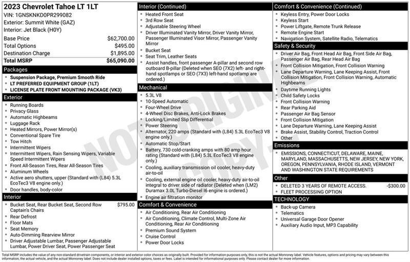 4WD, Jet Black Leather, 10-Way Power Driver & Passenger Seat Adjusters, 1st & 2nd Row Color-Keyed Carpeted Floor Mats, 2nd Row Manual Bucket Seats, 3.23 Rear Axle Ratio, 3rd row seats: split-bench, 4-Wheel Disc Brakes, 9 Speakers, ABS brakes, Air Conditioning, Alloy wheels, AM/FM radio: SiriusXM with 360L, Apple CarPlay/Android Auto, Auto High-beam Headlights, Auto-Dimming Inside Rear-View Mirror, Auto-dimming Rear-View mirror, Automatic temperature control, Bose 9-Speaker Stereo Audio System Feature, Brake assist, Bright Front & Rear Door Sill Plates, Bumpers: body-color, Color-Keyed Carpeting Floor Covering, Compass, Delay-off headlights, Deleted 3 Years of Remote Access, Driver & Front Outboard Passenger Airbags, Driver door bin, Driver vanity mirror, Dual front impact airbags, Dual front side impact airbags, Electronic Stability Control, Emergency communication system: OnStar and Chevrolet connected services capable, Enhanced Driver Information Center, Floor Console w/Storage Area, Four wheel independent suspension, Front anti-roll bar, Front Bucket Seats, Front Center Armrest, Front dual zone A/C, Front High-Back Reclining Bucket Seats, Front reading lights, Fully automatic headlights, Garage door transmitter, Hands-Free Rear Power Programmable Liftgate, Heated door mirrors, Heated Driver & Front Passenger Seats, Heated front seats, Illuminated entry, Infotainment Display, Leather-Appointed Seat Trim, LED Daytime Running Lamps, License Plate Front Mounting Package, Low tire pressure warning, Memory seat, Memory Settings for Driver, Navigation System, Occupant sensing airbag, Outside temperature display, Overhead airbag, Overhead console, Panic alarm, Passenger door bin, Passenger vanity mirror, Power door mirrors, Power driver seat, Power Liftgate, Power passenger seat, Power steering, Power windows, Preferred Equipment Group 1LT, Premium audio system: Chevrolet Infotainment 3 Premium, Premium Smooth Ride Suspension, Radio: Chevrolet Infotainment 3 Premium System, Rain sensing wipers, Rear air conditioning, Rear anti-roll bar, Rear reading lights, Rear seat center armrest, Rear window defroster, Rear window wiper, Remote keyless entry, Remote Start, Roof rack: rails only, Security system, SiriusXM Radio w/360L, Speed control, Speed-sensing steering, Split folding rear seat, Spoiler, Steering wheel mounted audio controls, Tachometer, Telescoping steering wheel, Tilt steering wheel, Traction control, Trip computer, Universal Home Remote, Variably intermittent wipers, Voltmeter, Wheels: 18" x 8.5" Bright Silver Painted Aluminum, Wireless Charging, Wrapped Steering Wheel, 4WD, Jet Black Leather. Summit White 2023 Chevrolet Tahoe LT 10-Speed Automatic with Overdrive EcoTec3 5.3L V8 4WD