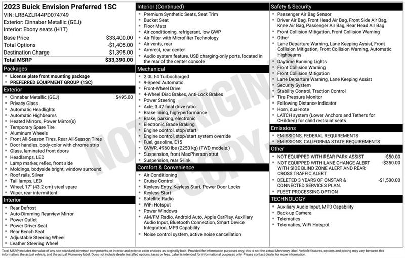3.47 Final Drive Axle Ratio, 4-Wheel Disc Brakes, 6 Speakers, 6-Speaker Audio System Feature, 8-Way Power Driver Seat Adjuster, ABS brakes, Air Conditioning, Alloy wheels, AM/FM radio: SiriusXM, Apple CarPlay/Android Auto, Auto High-beam Headlights, Auto-dimming door mirrors, Auto-dimming Rear-View mirror, Automatic Emergency Braking, Brake assist, Bumpers: body-color, Cloth w/Leatherette Seat Trim, Compass, Delay-off headlights, Deleted 3 Years of OnStar & Connected Services Plan, Driver door bin, Driver vanity mirror, Dual front impact airbags, Dual front side impact airbags, Electronic Stability Control, Emergency communication system: OnStar and Buick connected services capable, Following Distance Indicator, Forward Collision Alert, Four wheel independent suspension, Front anti-roll bar, Front Bin Center Console USB Ports, Front Bucket Seats, Front Center Armrest, Front Passenger 6-Way Manual Seat Adjuster, Front Pedestrian Braking, Front reading lights, Fully automatic headlights, Heated door mirrors, Illuminated entry, IntelliBeam Headlamp Control w/Auto High Beam, Knee airbag, Lane Keep Assist w/Lane Departure Warning, Low tire pressure warning, Not Equipped w/Lane Change & Rear Cross Traffic Alerts, Not Equipped w/Rear Park Assist, Occupant sensing airbag, Outside temperature display, Overhead airbag, Overhead console, Panic alarm, Passenger door bin, Passenger vanity mirror, Power door mirrors, Power driver seat, Power steering, Power windows, Preferred Equipment Group 1SC, Premium audio system: Buick Infotainment System, Radio data system, Radio: 8" Diagonal Buick Infotainment System, Rear anti-roll bar, Rear reading lights, Rear seat center armrest, Rear window defroster, Rear window wiper, Remote keyless entry, Security system, SiriusXM Radio, Speed control, Split folding rear seat, Spoiler, Steering wheel mounted audio controls, Telescoping steering wheel, Tilt steering wheel, Traction control, Trip computer, USB Charging-Only Ports, Variably intermittent wipers, Wheels: 18" Aluminum w/Light Charcoal Met Finish, Wireless Apple CarPlay/Wireless Android Auto. Cinnabar Metallic 2023 Buick Envision Preferred 9-Speed Automatic 2.0L Turbocharged FWD
