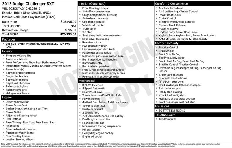 18" x 7.5" Aluminum Wheels, 4-Wheel Disc Brakes, 6 Speakers, ABS brakes, Air Conditioning, Alloy wheels, AM/FM radio, Anti-whiplash front head restraints, Audio Jack Input for Mobile Devices, Automatic temperature control, Brake assist, Bumpers: body-color, CD player, Cloth Low-Back Bucket Seats, Delay-off headlights, Driver door bin, Driver vanity mirror, Dual front impact airbags, Dual front side impact airbags, Electronic Stability Control, Four wheel independent suspension, Front anti-roll bar, Front Bucket Seats, Front Center Armrest, Front reading lights, Illuminated entry, Leather Shift Knob, Low tire pressure warning, Overhead airbag, Overhead console, Panic alarm, Passenger door bin, Passenger vanity mirror, Power door mirrors, Power driver seat, Power steering, Power windows, Quick Order Package 26E SXT, Radio: Media Center 130 CD/MP3, Rear anti-roll bar, Rear seat center armrest, Rear window defroster, Remote keyless entry, Speed control, Speed-sensing steering, Split folding rear seat, Steering wheel mounted audio controls, Tachometer, Telescoping steering wheel, Tilt steering wheel, Traction control, Trip computer, Variably intermittent wipers. Bright Silver Metallic Clearcoat 2012 Dodge Challenger SXT 5-Speed Automatic 3.6L V6 24V VVT RWD