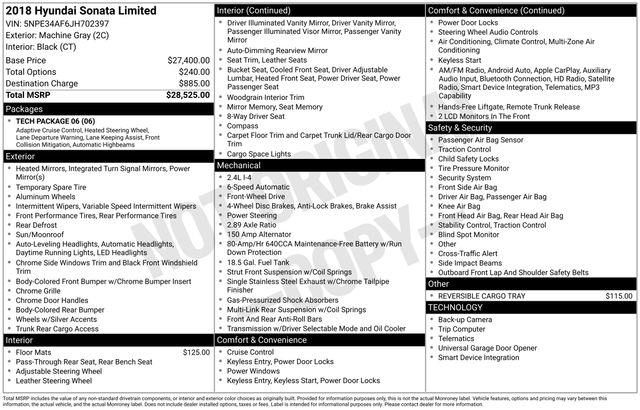 This recently arrived Machine Gray 2018 Hyundai Sonata Limited represents the top-of-the-line trim for its model year, featuring a refresh that brought sharper styling and improved technology. It is powered by the dependable 2.4L I4 GDI DOHC 16V engine, delivering 185 horsepower, paired with a 6-Speed Automatic with Shiftronic transmission, driving the Front-Wheel Drive (FWD) system. The Limited trim with the installed Tech Package 06 offers a highly luxurious and technology-rich driving experience.