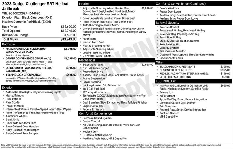 1-Yr SiriusXM Guardian Trial, 18 Speakers Premium Audio System, 4-Wheel Disc Brakes, 4G LTE Wi-Fi Hot Spot, 5-Year SiriusXM Traffic Service, 5-Year SiriusXM Travel Link Service, 6 Speakers, 8.4" Touchscreen Display, ABS brakes, Adaptive suspension, Air Conditioning, All Radio Equipped Vehicles, All VP4R Radios, Alloy wheels, AM/FM radio: SiriusXM, Anti-whiplash front head restraints, Apple CarPlay, Apple CarPlay/Android Auto, Auto High Beam Headlamp Control, Auto-dimming Rear-View mirror, Automatic temperature control, Black Seat Belts, Black/Demonic Red Seats, Blind Spot & Cross Path Detection, Body Color Exterior Mirrors, Brake assist, Bumpers: body-color, Compass, Compass Gauge, Delay-off headlights, Demonic Red Seat Belts, Driver Convenience Group, Driver door bin, Driver vanity mirror, Dual front impact airbags, Dual front side impact airbags, Electronic Stability Control, Emergency communication system: SiriusXM Guardian, Exterior Mirrors w/Heating Element, For Details, Visit DriveUconnect.com, For More Info, Call 800-643-2112, Four wheel independent suspension, Front anti-roll bar, Front Bucket Seats, Front Center Armrest, Front dual zone A/C, Front reading lights, Fully automatic headlights, Garage door transmitter, Google Android Auto, GPS Antenna Input, GPS Navigation, harman/kardon Audio Group w/Subwoofer, harman/kardon GreenEdge Amp, HD Radio, Heated door mirrors, Heated Front Seats, Heated front seats, Heated Steering Wheel, Heated steering wheel, High-Intensity Discharge Headlamps, Illuminated entry, Integrated Center Stack Radio, Integrated Voice Command w/Bluetooth, Jailbreak IP Badge, Leather Shift Knob, Low tire pressure warning, Media Hub (2 USB, AUX), Outside temperature display, Overhead airbag, Overhead console, Panic alarm, ParkView Rear Back-Up Camera, Passenger door bin, Passenger vanity mirror, Power door mirrors, Power driver seat, Power Multi-Function Foldaway Mirrors, Power steering, Power windows, Quick Order Package 26K Hellcat Jailbreak, Radio data system, Radio: Uconnect 4C Nav w/8.4" Display, Radio: Uconnect 4C w/8.4" Display, Rain Sensitive Windshield Wipers, Rear anti-roll bar, Rear reading lights, Rear seat center armrest, Rear window defroster, Red Floor Mat Binding, Red LED Alcantara Steering Wheel, Remote keyless entry, Security system, Shark Fin Antenna, SiriusXM Radio Service, SiriusXM Satellite Radio, SiriusXM Traffic Plus, SiriusXM Travel Link, Speed control, Speed-sensing steering, Split folding rear seat, Spoiler, Sport steering wheel, SRT Hellcat Logo Houndstooth Seats, Steering wheel mounted audio controls, Surround Sound, Tachometer, Technology Group, Telescoping steering wheel, Tilt steering wheel, Traction control, Trip computer, Trunk Mounted Subwoofer, USB Host Flip, Variably intermittent wipers, Wheels: 20" x 9.5" Low Gloss Black Drag. Pitch Black Clearcoat 2023 Dodge Challenger SRT Hellcat Jailbreak 8-Speed Automatic 6.2L 8-Cylinder SMPI Supercharged OHV RWD