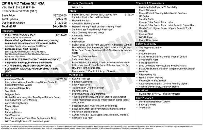 20" x 9" Polished Aluminum Wheels, 3.08 Rear Axle Ratio, 3rd row seats: split-bench, 4-Wheel Antilock Disc Brakes, 4-Wheel Disc Brakes, 5 Auxiliary 12-volt Power Outlets, 9 Speakers, ABS brakes, Adjustable pedals, Air Conditioning, Alloy wheels, AM/FM radio: SiriusXM, Apple CarPlay/Android Auto, Auto High-beam Headlights, Auto-dimming door mirrors, Auto-dimming Rear-View mirror, Automatic temperature control, Black Assist Steps w/Chrome Strip, Bose Premium 9-Speaker System, Brake assist, Bumpers: body-color, CD Player, CD player, Compass, Delay-off headlights, Driver door bin, Driver vanity mirror, Dual front impact airbags, Dual front side impact airbags, Electronic Stability Control, Emergency communication system: OnStar Guidance, Enhanced Driver Alert Package, Exterior Parking Camera Rear, Forward Collision Alert, Front anti-roll bar, Front Bucket Seats, Front Center Armrest, Front dual zone A/C, Front fog lights, Front reading lights, Front wheel independent suspension, Full-Feature Reclining Bucket Seats, Fully automatic headlights, Garage door transmitter: HomeLink, Hands Free Power Liftgate, Heated & Ventilated Driver & Front Passenger Seats, Heated door mirrors, Heated front seats, Heated Leather-Wrapped Steering Wheel, Heated rear seats, Heated steering wheel, Illuminated entry, Inside Rear-View Auto-Dimming Mirror, IntelliBeam Automatic High Beam On/Off Headlamps, Lane Change Alert w/Side Blind Zone Alert, Lane Keep Assist w/Lane Departure Warning, License Plate Front Mounting Package, Low Speed Forward Automatic Braking, Low tire pressure warning, Memory Package, Memory seat, Occupant sensing airbag, OnStar 4G LTE, OnStar Basic Plan For 5 Years, Open Road Package, Outside temperature display, Overhead airbag, Overhead console, Panic alarm, Passenger door bin, Passenger vanity mirror, Passive Entry System, Pedal memory, Perforated Leather-Appointed Seat Trim, Power door mirrors, Power driver seat, Power Liftgate, Power passenger seat, Power Release 2nd Row 60/40 Split-Folding Bench Seat, Power Release Second Row Bucket Seats, Power steering, Power Tilt & Telescopic Steering Column, Power Tilt-Sliding Sunroof w/Express-Open/Close, Power windows, Power-Adjustable Pedals For Accelerator & Brake, Preferred Equipment Group 4SA, Premium audio system: IntelliLink, Premium Smooth Ride Suspension Package, Push Button Keyless Start, Radio: AM/FM/SiriusXM, Radio: AM/FM/SiriusXM w/Navigation, Rain sensing wipers, Rear air conditioning, Rear anti-roll bar, Rear Cross-Traffic Alert, Rear reading lights, Rear Seat Blu-Ray/DVD Entertainment System, Rear seat center armrest, Rear window defroster, Rear window wiper, Remote Keyless Entry, Remote keyless entry, Roof rack: rails only, Security system, SiriusXM NavTraffic, SiriusXM Satellite Radio, Speed control, Speed-sensing steering, Split folding rear seat, Spoiler, Steering wheel memory, Steering wheel mounted audio controls, Tachometer, Telescoping steering wheel, Tilt steering wheel, Traction control, Trip computer, Turn signal indicator mirrors, Universal Home Remote, Variably intermittent wipers, Ventilated front seats, Voltmeter, Wheels: 18" x 8.5" Bright Machined Aluminum. Summit White 2018 GMC Yukon SLT 6-Speed Automatic Electronic with Overdrive EcoTec3 5.3L V8 RWD
