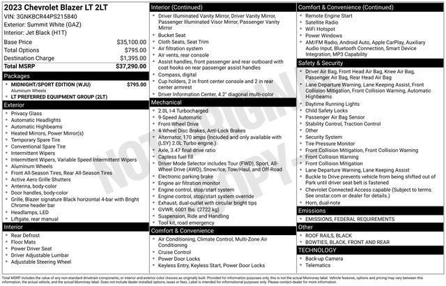 170 Amp Alternator, 3.47 Final Drive Axle Ratio, 4-Way Manual Front Passenger Seat Adjuster, 4-Wheel Disc Brakes, 6 Speakers, 6-Speaker Audio System Feature, 8-Way Power Driver Seat Adjuster, ABS brakes, Air Conditioning, Alloy wheels, AM/FM radio: SiriusXM with 360L, Apple CarPlay/Android Auto, Auto High-beam Headlights, Automatic temperature control, Black Roof-Mounted Side Rails, Brake assist, Bumpers: body-color, Child-Seat-Sensing Airbag, Compass, Delay-off headlights, Driver door bin, Driver vanity mirror, Dual front impact airbags, Dual front side impact airbags, Electronic Stability Control, Emergency communication system: OnStar and Chevrolet connected services capable, Four wheel independent suspension, Front & Rear Black Bowties, Front anti-roll bar, Front Bucket Seats, Front Center Armrest, Front dual zone A/C, Front reading lights, Fully automatic headlights, Heated door mirrors, Illuminated entry, Knee airbag, Leather Shift Knob, Low tire pressure warning, Midnight/Sport Edition, Occupant sensing airbag, Outside temperature display, Overhead airbag, Overhead console, Panic alarm, Passenger door bin, Passenger vanity mirror, Power door mirrors, Power Driver Lumbar Control, Power driver seat, Power steering, Power windows, Preferred Equipment Group 2LT, Premium audio system: Chevrolet Infotainment 3 Plus, Premium Cloth Seat Trim, Radio data system, Radio: Chevrolet Infotainment 3 Plus System, Rear anti-roll bar, Rear reading lights, Rear seat center armrest, Rear window defroster, Rear window wiper, Remote keyless entry, Ride & Handling Suspension, Security system, SiriusXM w/360L, Speed control, Speed-sensing steering, Split folding rear seat, Spoiler, Steering wheel mounted audio controls, Tachometer, Telescoping steering wheel, Tilt steering wheel, Traction control, Trip computer, Variably intermittent wipers, Voltmeter, Wheels: 18" Grazen Metallic Aluminum, Wheels: 18" High Gloss Black Painted Aluminum. Summit White 2023 Chevrolet Blazer LT 9-Speed Automatic with Overdrive 2.0L Turbocharged FWD