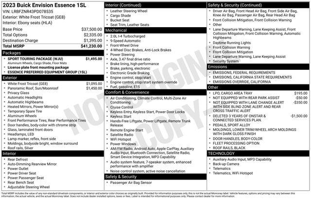 Envision Essence, 4D Sport Utility, 2.0L Turbocharged, 9-Speed Automatic, FWD, White Frost Tricoat, Ebony Seats Leather, Black Roof Rails, Body-Color Door Handles, Carpeted Front & Rear Floor Mats, Lower Trim/Wheel Arch Moldings, Power Panoramic Tilt-Sliding Moonroof, Preferred Equipment Group 1SL, Rear Cargo Compartment Cover, Sport Alloy Pedals, Sport Touring Package, Wheels: 20" Aluminum w/Dark Finish, 3.47 Final Drive Axle Ratio, 4-Wheel Disc Brakes, 7 Speakers, 7-Speaker Audio System Feature w/Amplifier, 8-Way Power Driver Seat Adjuster, ABS brakes, Air Conditioning, Alloy wheels, AM/FM radio: SiriusXM, Apple CarPlay/Android Auto, Auto High-beam Headlights, Auto-dimming door mirrors, Auto-dimming Rear-View mirror, Automatic Emergency Braking, Automatic temperature control, Brake assist, Bumpers: body-color, Cargo Area Tray (LPO), Compass, Delay-off headlights, Deleted 3 Years of OnStar & Connected Services Plan, Driver door bin, Driver vanity mirror, Dual front impact airbags, Dual front side impact airbags, Electronic Stability Control, Emergency communication system: OnStar and Buick connected services capable, Following Distance Indicator, Forward Collision Alert, Four wheel independent suspension, Front anti-roll bar, Front Bin Center Console USB Ports, Front Bucket Seats, Front Center Armrest, Front dual zone A/C, Front Passenger 8-Way Power Seat Adjuster, Front Pedestrian Braking, Front reading lights, Fully automatic headlights, Heated door mirrors, Heated Driver & Front Passenger Seats, Heated front seats, Heated steering wheel, Illuminated entry, IntelliBeam Headlamp Control w/Auto High Beam, Knee airbag, Lane Keep Assist w/Lane Departure Warning, Low tire pressure warning, Memory seat, Not Equipped w/Lane Change & Rear Cross Traffic Alerts, Not Equipped w/Rear Park Assist, Occupant sensing airbag, Outside temperature display, Overhead airbag, Overhead console, Panic alarm, Passenger door bin, Passenger vanity mirror, Perforated Leather-Appointed Seat Trim, Power door mirrors, Power driver seat, Power Liftgate, Power passenger seat, Power steering, Power windows, Premium audio system: Buick Infotainment System, Radio data system, Radio: Buick Infotainment System AM/FM Stereo, Rear anti-roll bar, Rear reading lights, Rear seat center armrest, Rear window defroster, Rear window wiper, Remote keyless entry, Security system, SiriusXM Radio, Speed control, Split folding rear seat, Spoiler, Steering wheel mounted audio controls, Telescoping steering wheel, Tilt steering wheel, Traction control, Trip computer, USB Charging-Only Ports, Variably intermittent wipers, Wireless Apple CarPlay/Wireless Android Auto, Envision Essence, 4D Sport Utility, 2.0L Turbocharged, 9-Speed Automatic, FWD, White Frost Tricoat, Ebony Seats Leather, Black Roof Rails, Body-Color Door Handles, Carpeted Front & Rear Floor Mats, Lower Trim/Wheel Arch Moldings, Power Panoramic Tilt-Sliding Moonroof, Preferred Equipment Group 1SL, Rear Cargo Compartment Cover, Sport Alloy Pedals, Sport Touring Package, Wheels: 20" Aluminum w/Dark Finish. White Frost Tricoat 2023 Buick Envision Essence FWD 9-Speed Automatic 2.0L Turbocharged